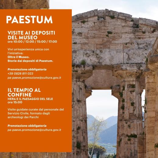 VISITE AI DEPOSITI DEL MUSEO. A Paestum, alle 10, 12, 15 e 17, si potranno scoprire i depositi del Museo e i suoi tesori nascosti che risvegliano antiche leggende e che permettono di vivere un’esperienza unica con l’iniziativa “Oltre il Museo. Storie dai depositi di Paestum”. Prenotazione obbligatoria al numero 0828811023 o alla mail pa-paeve.promozione@cultura.gov.it