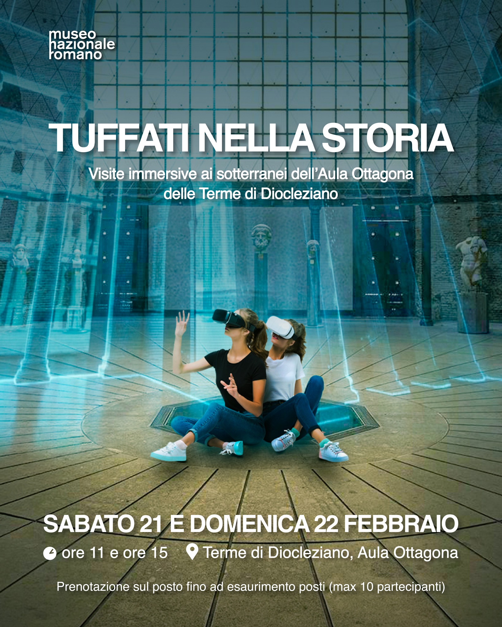 Week end speciale alle Terme di Diocleziano promosso dal museo nazionale Romano che invita a fare un salto nel passato con una visita immersiva in realtà virtuale scendendo nei sotterranei delle Terme di Diocleziano per esplorare le trasformazioni della Roma antica, dalla costruzione delle Terme fino ad oggi. Appuntamento sabato 21 e domenica 22 febbraio 2026, alle 11 e alle 15, nell’Aula Ottagona delle Terme di Diocleziano. Prenotazione sul posto fino a esaurimento posti (massimo di partecipanti 10). Per info: mn-rm.servizioeducativo@cultura.gov.it.