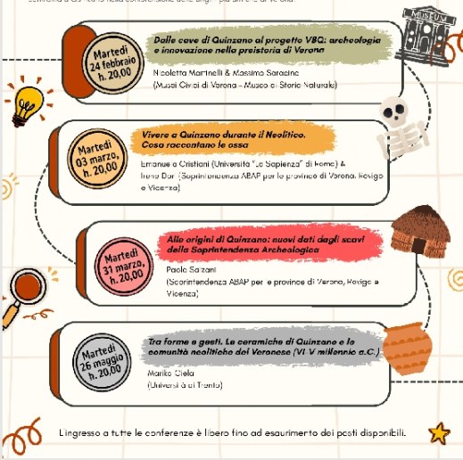 Programma. Martedì 24 febbraio 2026, Nicoletta Martinelli & Massimo Saracino (Musei Civici di Verona – Museo di Storia Naturale), “Dalle cave di Quinzano al progetto VBQ: archeologia e innovazione nella preistoria di Verona”; martedì 3 marzo 2026, Emanuela Cristiani (università “La Sapienza” di Roma) & Irene Dori (soprintendenza ABAP per le province di Verona Rovigo e Vicenza), “Vivere a Quinzano durante il Neolitico. Cosa raccontano le ossa”; martedì 31 marzo 2026, Paola Salzani (soprintendenza ABAP per le province di Verona Rovigo e Vicenza), “Alle origini di Quinzano: nuovi dati dagli scavi della Soprintendenza Archeologica”; martedì 26 maggio 2026, Marika Ciela (università di Trento), “Tra forme e gesti. Le ceramiche di Quinzano e le comunità neolitiche del Veronese (VI–V millennio a.C.)”.