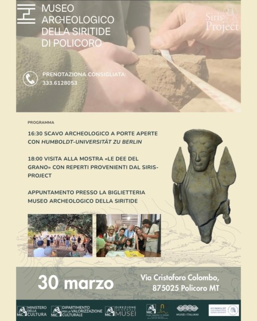 Lunedì 30 marzo 2026, alle 16.30, al museo Archeologico nazionale della Siritide (Policoro, Mt), porte aperte alle indagini archeologiche del progetto Siris Project 2026 della Humboldt-Universität di Berlino riprese da una settimana. Un’occasione unica per scoprire da vicino il lavoro degli archeologi. Sarà il direttore Carmelo Colelli con Annarita Doronzio e i suoi studenti ad aprire le porte dei cantieri per raccontare obiettivi e novità della campagna di ricerca di quest’anno. Alle 18, visita guidata alla mostra “Le dee del grano” che presenta anche reperti provenienti dal Siris Project. Prenotazione consigliata al 3336128053. Attività inclusa nel biglietto di ingresso (escluse gratuità di legge).