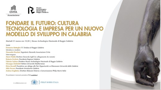 Martedì 31 marzo 2026, alle 10, al museo Archeologico nazionale di Reggio Calabria, la tavola rotonda “Fondare il futuro: cultura, tecnologia e impresa per un nuovo modello di sviluppo in Calabria”, promossa da Associazione Civita, occasione per approfondire il ruolo strategico della cultura come leva di sviluppo territoriale, in dialogo con innovazione tecnologica e sistema produttivo, con un focus sulle prospettive di crescita della Calabria e del Mezzogiorno. Dopo i saluti di Domenico Battaglia, f. f. sindaco di Reggio Calabria; introduce e modera la tavola rotonda Simonetta Giordani, segretario generale Associazione Civita; intervengono Roberto Occhiuto, presidente Regione Calabria; Fabrizio Sudano, direttore museo Archeologico nazionale di Reggio Calabria; Mario Nobile, direttore generale AgID (in collegamento da remoto); Giuseppe Zimbalatti, rettore università Mediterranea; Andrea Guglielmo, direttore relazioni esterne e comunicazione Philip Morris Italia; Elvira Brunelli, prorettrice università della Calabria; Aldo Ferrara, presidente Unindustria Calabria. Per partecipare è necessario registrarsi al seguente link: