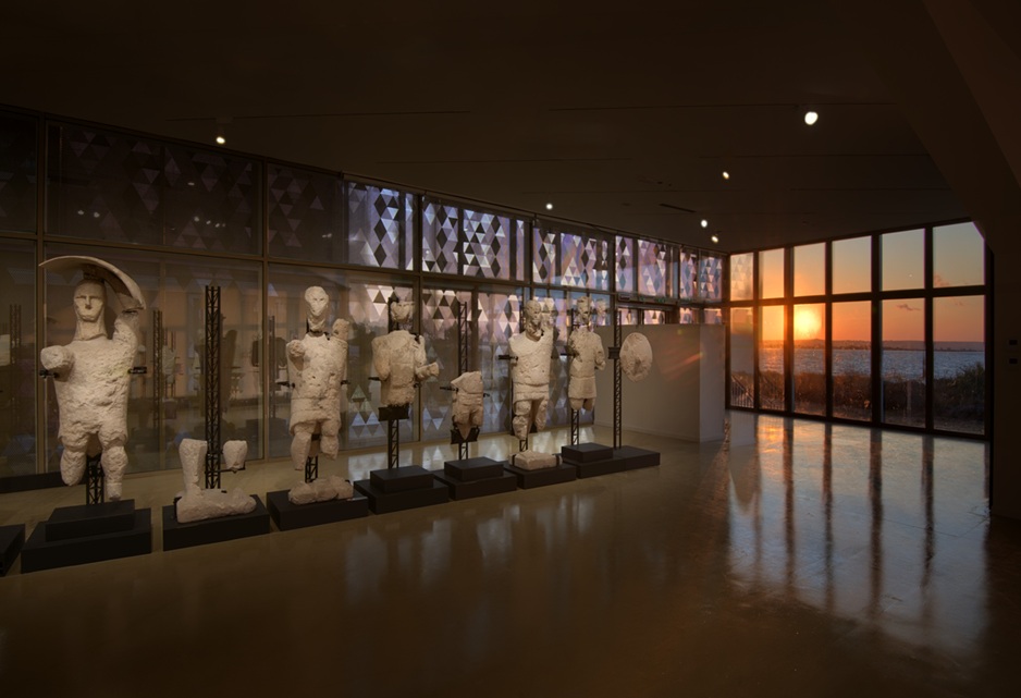 Museo civico di Cabras: la luce del tramonto accarezza i Giganti di Mont’e Prama riuniti (foto nicola castangia / fond. mont’e prama)