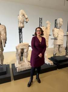 L’assessore regionale Ilaria Portas davanti ai Giganti riuniti al museo di Cabras (foto da FB – profilo ilaria portas)