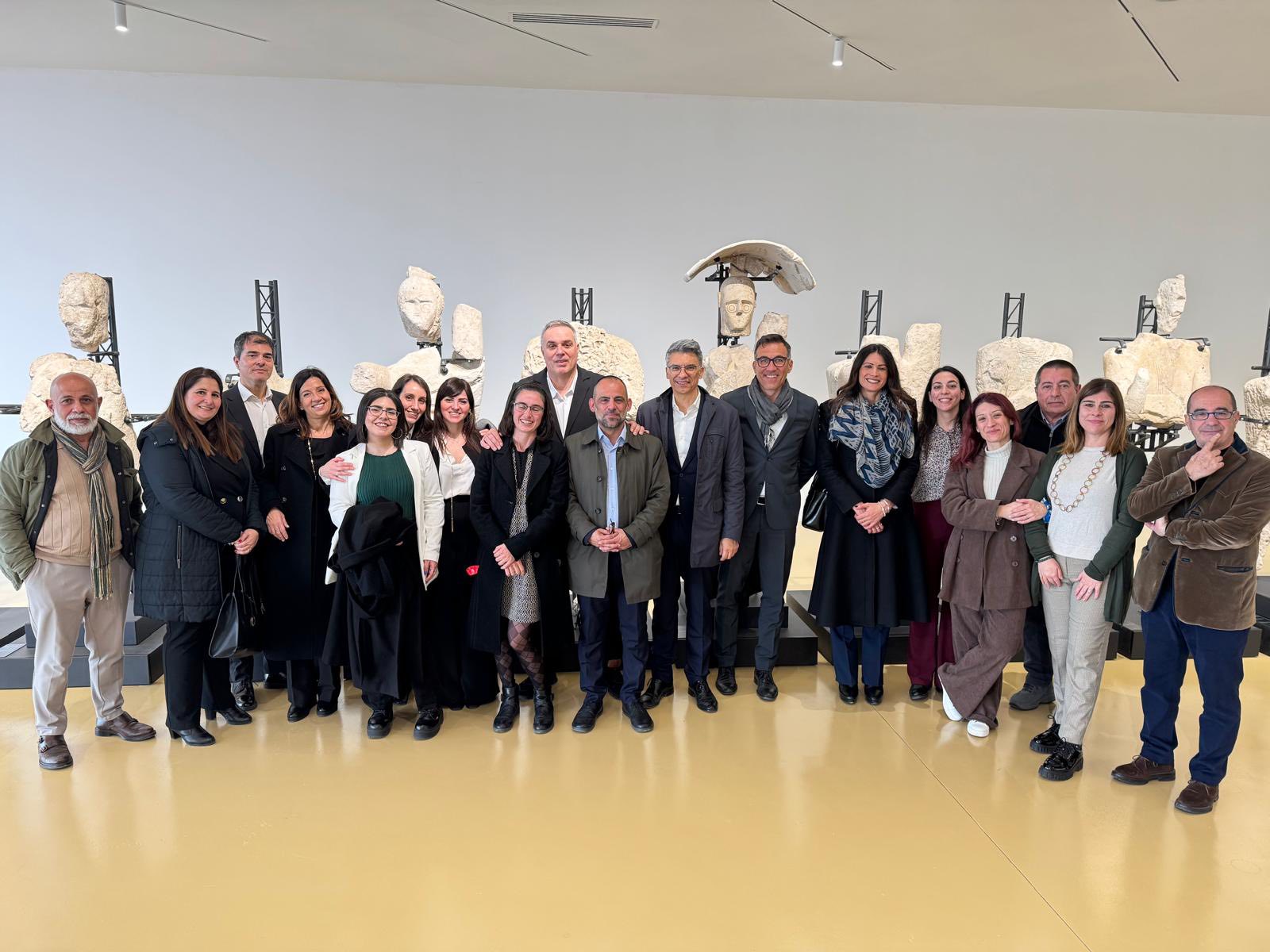 Anthony Muroni al centro del gruppo della Fondazione Mont’e Prama davanti ai Giganti riuniti al museo di Cabras (foto nicola castangia / fond. mont’e prama)