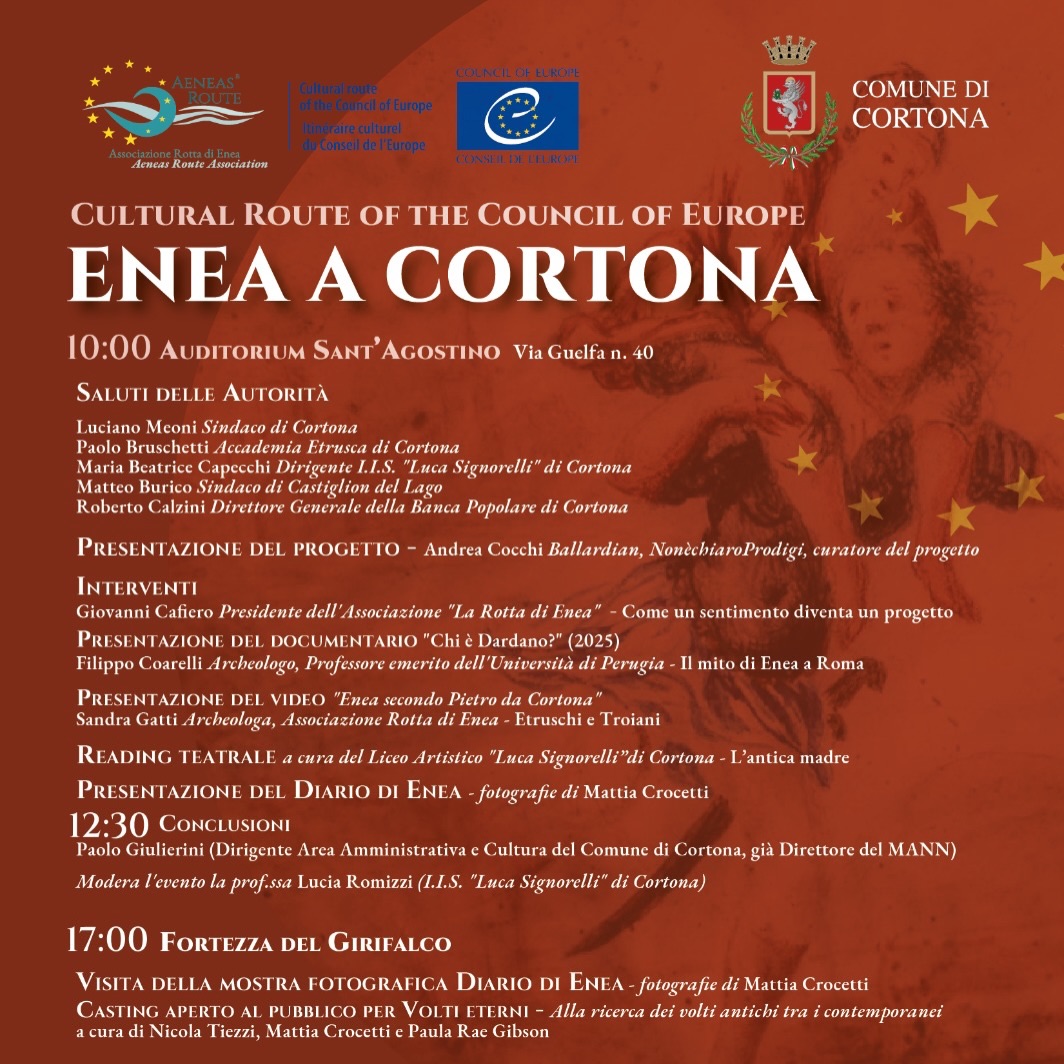 Lo sapevate che il viaggio di Enea è anche un ritorno a Cortona? Giovedì 23 aprile 2026, alle 10, al centro convegni Sant’Agostino in via Guelfa 40 a Cortona, “Enea a Cortona”: giornata di incontri, racconti, immagini e performance, nell’ambito della Cultural Route of the Council of Europe, organizzata dal Comune di Cortona e dall’associazione la Rotta di Enea: occasione per approfondire i valori contenuti nell’opera di Virgilio, poeta europeo per eccellenza, per valorizzare il patrimonio culturale condiviso, per riflettere sul mito e la storia degli Etruschi e il rapporto con la tradizione troiana.