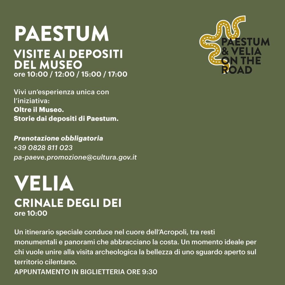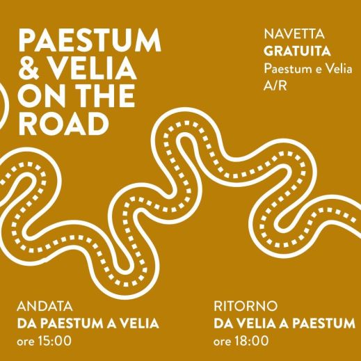PAESTUM & VELIA ON THE ROAD. Servizio di navetta da Paestum a Velia e ritorno. La navetta gratuita partirà alle ore 15:00 dal parcheggio Voza, a pochi passi dall’area archeologica di Paestum, raggiungerà Velia e, alle ore 18:00, ritornerà a Paestum. Il servizio è incluso nel biglietto di ingresso ai Parchi e nell’abbonamento Paestum&Velia. Per usufruirne, è obbligatorio ritirare il “ticket navetta” presso le biglietterie dei Parchi prima della partenza. Per informazioni telefonare al +39 0828811023 oppure scrivere a pa-paeve.promozione@cultura.gov.it.