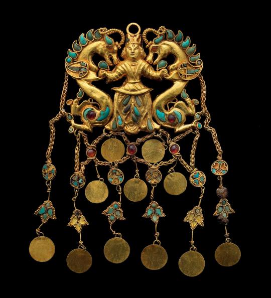 Il tesoro delle sei tombe appartenenti a una famiglia nobile, se non principesca, di nomadi kushan, è noto da allora come “oro della Battria” e costituisce senza dubbio una delle scoperte archeologiche più importanti del XX secolo. Tra gli esempi più sorprendenti dei manufatti in oro ritrovati nelle tombe figurano una statuetta di Afrodite alata modellata secondo le forme sinuose di una divinità indiana, due fermagli decorati da figure di soldati macedoni, una corona completamente smontabile e trasportabile come si conveniva a un popolo nomade e due fibbie da calzatura che raffigurano un uomo su un carro forse volante che nelle forme, come pure per i dragoni che lo guidano, rivela un’ispirazione chiaramente cinese.