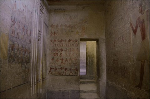 La cappella della mastaba di Ptah-hotep e Ankh-hotep a Sakkara con la scena della macellazione rituale alla sinistra della porta