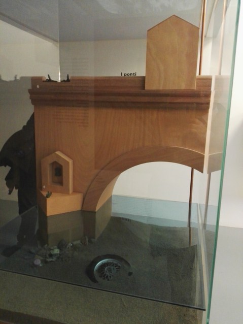 Alle estremità contrapposte della sala le testimonianze dei due capolinea: Ariminum, evocata con la ricostruzione dell’Arco di Augusto, che corrisponde all’innesto della Via Aemilia alla Via Flaminia, e l’esposizione del corredo funerario di uno dei primi coloni romani della città; e Placentia, ricordata con i rilievi di uno spettacolare fregio d’armi che coronava un monumento funerario. Cadenzano il percorso sette “espositori-teatrini”, exhibit archeologici avanzati (sette come i temi trasversali) che espongono i reperti insieme a piccole videoproiezioni che li animano e li rendono narrativi. I temi proposti sono: Limite, Ponte, Sepolture, Commercio, Foro, Locanda e Casa. Vediamo di approfondirne qualcuno.