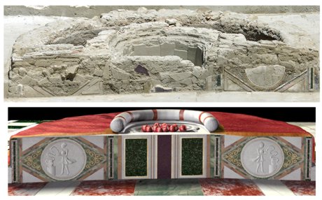 La villa del V secolo d.C. “La villa conobbe il momento di massimo splendore nel V secolo”, scrive Volpe, “quando il settore residenziale e le terme furono oggetto di importanti interventi edilizi: sulle strutture preesistenti e sui resti degli edifici crollati probabilmente a seguito di terremoti, fu costruita una sontuosa sala da pranzo (cenatio) e le terme furono notevolmente ampliate e abbellite. Le trasformazioni principali riguardarono il pavimento e la sistemazione di un tipo particolare di divano per banchetto (stibadium) in muratura, provvisto di una fontana. Il pavimento, sovrapposto al precedente mosaico, fu realizzato con lastre di marmo di vario tipo e colore. Particolare rilievo avevano tre tappeti in opus sectile, inseriti nella pavimentazione marmorea. Caratterizzati dalla complessa combinazione di forme geometriche, dalla successione di cornici riccamente decorate e da elementi del repertorio vegetale”. L’elemento di maggior spicco della cenatio era costituito dallo stibadium, “il divano in muratura per il banchetto, collocato in posizione dominante della sala. Di forma semicircolare, aveva lo spazio centrale occupato da una vaschetta. Il rivestimento della struttura era costituito da lastre di marmo bianco e da ricercate decorazioni in opus sectile marmoreo, mosaico ed elementi scultorei figurati. Al di sopra della vasca, posta al centro del divano in muratura, era sistemata una mensa di marmo bianco molto pregiata e rara, caratterizzata dalla presenza di lobi circolari per l’alloggiamento dei piatti per il banchetto. È molto probabile che l’acqua fuoriuscisse a cascata dalla vaschetta, andando a riempire la parte centrale della sala da pranzo, ribassata rispetto ai corridoi laterali, formando, con i tappeti in opus sectile, uno straordinario effetto scenografico grazie al gioco di riflessi che enfatizzava la cromia dei marmi, oltre a garantire una piacevole frescura durante i banchetti estivi”. La cura del corpo, la caccia, il banchetto fanno parte dell’ideologia dell’aristocrazia tardo-antica.