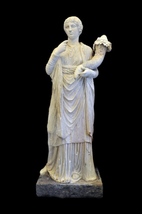Esposti a Vittorio Veneto ci sono dunque quattro reperti: un Puteale in marmo (bacino per la raccolta dell’acqua), degli inizi del I secolo d.C. con tralci di vite: un motivo che connota l’abbondanza e il benessere, derivante dal fregio posto sul lato anteriore dell’Ara Pacis Augustae, l’altare che – com’è noto – Augusto dedicò nel 9 a.C. proprio alla Pace. Quindi si può ammirare una bella Lastra campana in terracotta dal forte significato politico: Perseo – al centro della scena – identifica Ottaviano, Medusa è Cleopatra, l’ultima regina d’Egitto, mentre l’offerta della testa di Medusa ad Atena evoca la pacificazione universale garantita dalla battaglia di Azio del 31 a.C. A partire dall’età augustea la dea Fortuna inizia a essere raffigurata con patera e cornucopia, attributi che la caratterizzano quale dea della Concordia o Abbondanza. In tal modo appare nel medaglione in argento proveniente da Pompei e databile tra il 50 e il 79 d.C., altro prestito prestigioso del Mann. La Fortuna è una divinità spesso associata alla figura di Augusto e la patera e i frutti della terra raccolti nel corno sono i simboli della pace e della ricchezza dei tempi. Infine, imponente nei suoi due metri di altezza, eccola la statua della Concordia in marmo (inizi del I secolo d.C.) figura che in età romana simboleggiò la fedeltà di tutto l’esercito verso l’imperatore. Questo esemplare proviene dall’edificio di Eumachia a Pompei e anche in questo caso la cornucopia è simbolo di abbondanza che richiama i tempi di pace e dell’età augustea.