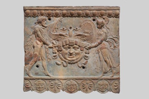 Lastra campana in terracotta: Perseo-Ottaviano offre la testa di Medusa-Cleopatra alla dea Atena, evocando la pacificazione universale dopo la battaglia di Azio del 31 a.C.