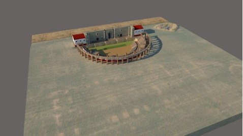 L’ipotesi di ricostruzione del teatro di Claterna su foto aerea del sito (grafuca 3D di Paolo Nanni)