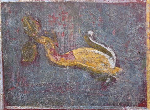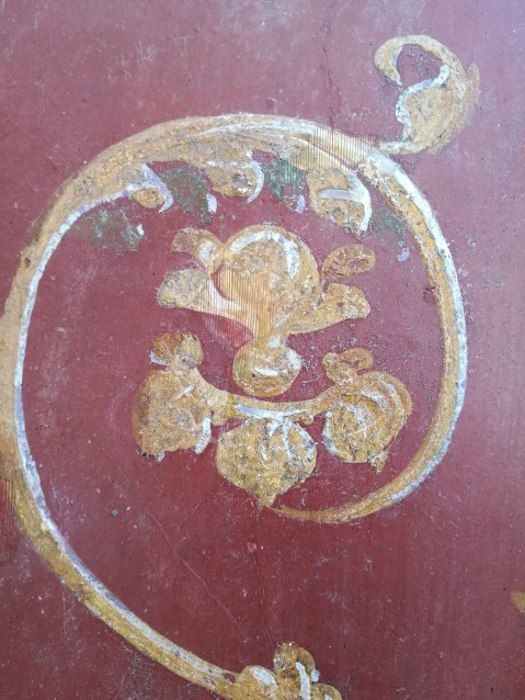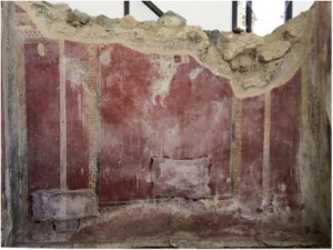Particolare della reintegrazione pittorica a tratteggio nella Schola Armaturarum (foto Parco archeologico di Pompei)