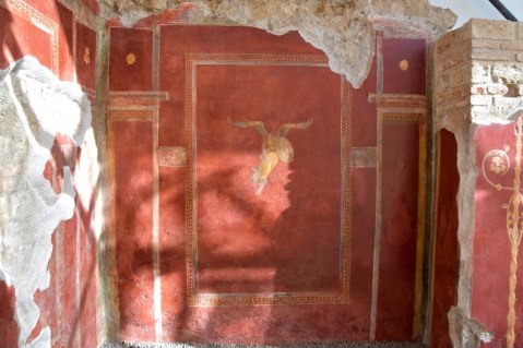 Gli affreschi recuperati con i restauri della Schola Armaturarum a Pompei (foto Parco archeologico di Pompei)