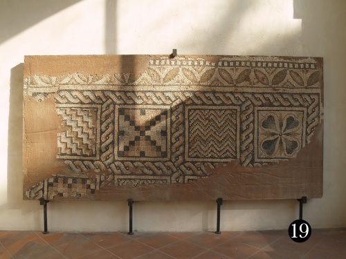 Nella parte orientale di Faventia, nei primi secoli dell’Impero, erano presenti domus di vasta estensione, caratterizzate dalla presenza di mosaici estremamente raffinati. Ne sono un esempio le porzioni di pavimentazioni nn. 5, 6, 7, 9, 1O, 11, le prime tre scavate nel 1993 e le altre scoperte nel 1899. Solo attraverso uno studio attento delle caratteristiche di questi pavimenti si è potuto appurare che facevano parte di un’unica, estesa abitazione. A questa domus appartenevano anche altri due pavimenti a mosaico, integri, attualmente esposti a TAMO – Ravenna. Per le zone residenziali e di rappresentanza della domus veniva utilizzato il mosaico, sia con una decorazione ripetitiva e continua, chiamata per questo motivo “a tappeto” (ad es. n. 12), sia utilizzando riquadri (emblemata) con raffigurazioni più o meno complesse (ad es. n. 13). In questo secondo caso il committente sceglieva temi legati alla moda del tempo o che potevano esaltare in modo allusivo la sua figura o la sua ospitalità. In alcuni casi i pavimenti erano realizzati in marmi colorati, con raffigurazioni geometriche (opus sectile). Oltre al mosaico, in età romana per le pavimentazioni erano utilizzati diversi materiali; in alcuni ambienti residenziali, soprattutto tra il II sec. a.C. e il I sec. d.C. veniva impiegato anche il battuto di cocciopesto (ad es. n. 8) sia decorato con frammenti marmorei distribuiti disordinatamente, sia a formare delle raffigurazioni geometriche o in taluni casi privi di decorazione. Nelle zone di maggiore utilizzo erano impiegate le pavimentazioni in laterizio (ad es. n. 2) realizzate in varie fogge: con mattoncini posati a spina pesce, a coltello o di piatto oppure conformati ad esagonette, rombi, talvolta decorati con tessere in pietra. In età tardo antica (IV-VII secolo d.C.) la città di Faenza subì l’influenza di Ravenna, divenuta capitale nel 402 d.C. Per questo motivo vennero costruite residenze di rappresentanza di vasta estensione e riccamente decorate con mosaici policromi. Ne sono testimonianza le pavimentazioni rinvenute in particolar modo nell’area a Nord-Est della città come le nn. 12, 14 e 19, appartenenti a un unico complesso abitativo databile attorno al V sec. d.C., o il grande mosaico scoperto in piazza Martiri della Libertà (n. 16) pertinente a un ambiente di m 14×8.