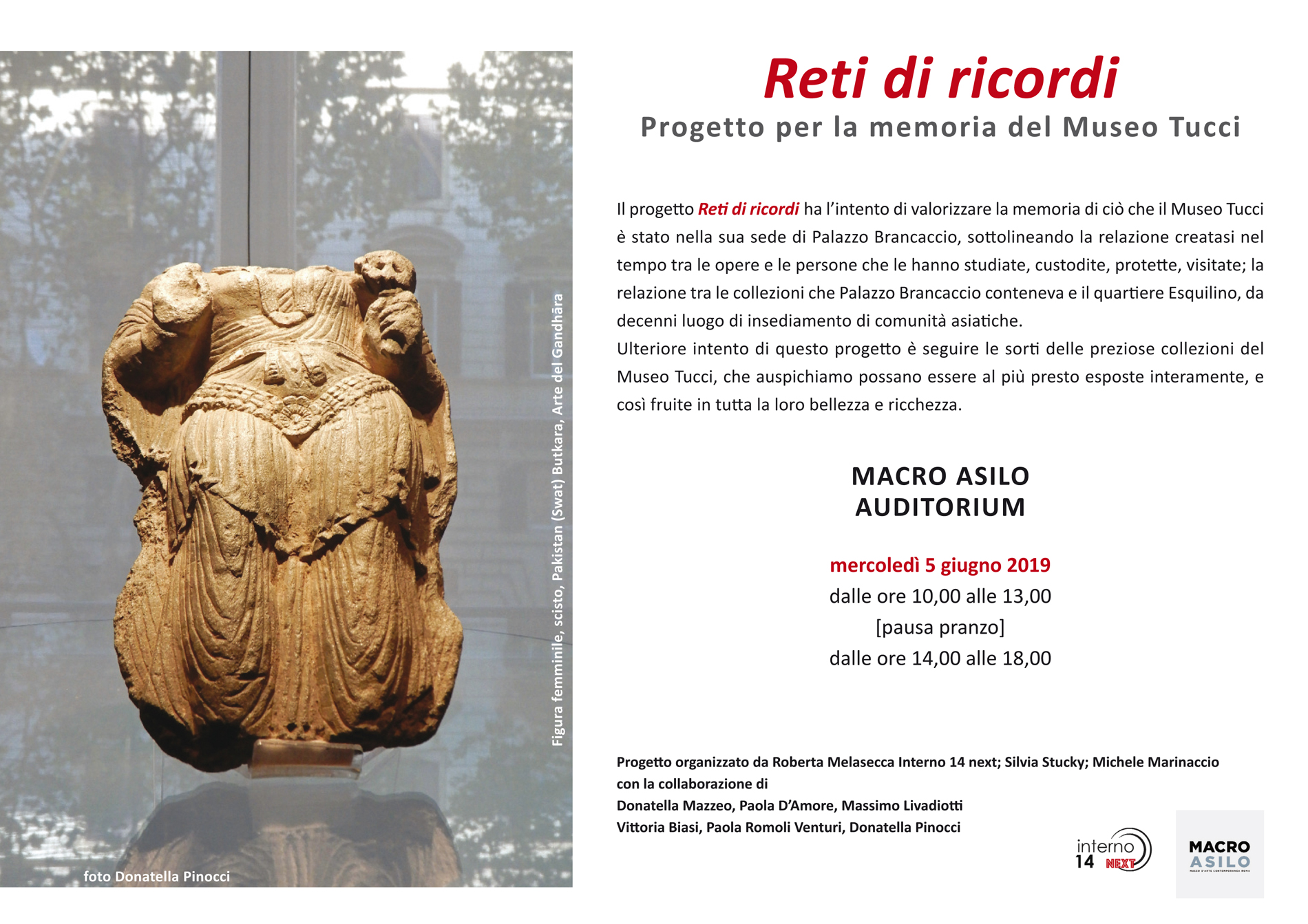 Il 31 ottobre 2017 le porte di Palazzo Brancaccio in via Merulana 248 a Roma, storica sede del museo nazionale d’Arte Orientale intitolato a Giuseppe Tucci, si sono chiuse al pubblico, ed è iniziato il trasferimento delle collezioni al museo delle Civiltà all’EUR. “Questo”, sottolinea Roberta Malasecca di Interno 14 Next, “non può lasciare indifferenti le persone che hanno frequentato e amato il museo nella sede che ha avuto per sessant’anni (dal 1957 al 2017), poiché le sue collezioni sono come un organismo vivente che ora ha cambiato le sue coordinate spaziali e, soprattutto, la sua relazione con il territorio circostante”. Nasce così “Reti di ricordi. Progetto per la memoria del Museo Tucci” a cura di Roberta Melasecca, Silvia Stucky, Michele Marinaccio, con Donatella Mazzeo, Paola D’Amore, Massimo Livadiotti, Vittoria Biasi, Paola Romoli Venturi, Donatella Pinocci. Il 5 giugno 2019, dalle 10 alle 13, e dalle 14 alle 18, l’Auditorium del MACRO Museo d’Arte Contemporanea di Roma ospita il progetto “Reti di ricordi. Progetto per la memoria del Museo Tucci”: una giornata di memorie, dialoghi e proposte su ciò che il museo nazionale d’Arte Orientale “Giuseppe Tucci” è stato nella sua sede di Palazzo Brancaccio, nel cuore del Rione Esquilino a Roma, con l’auspicio che le sue collezioni possano essere nuovamente esposte nella loro interezza.