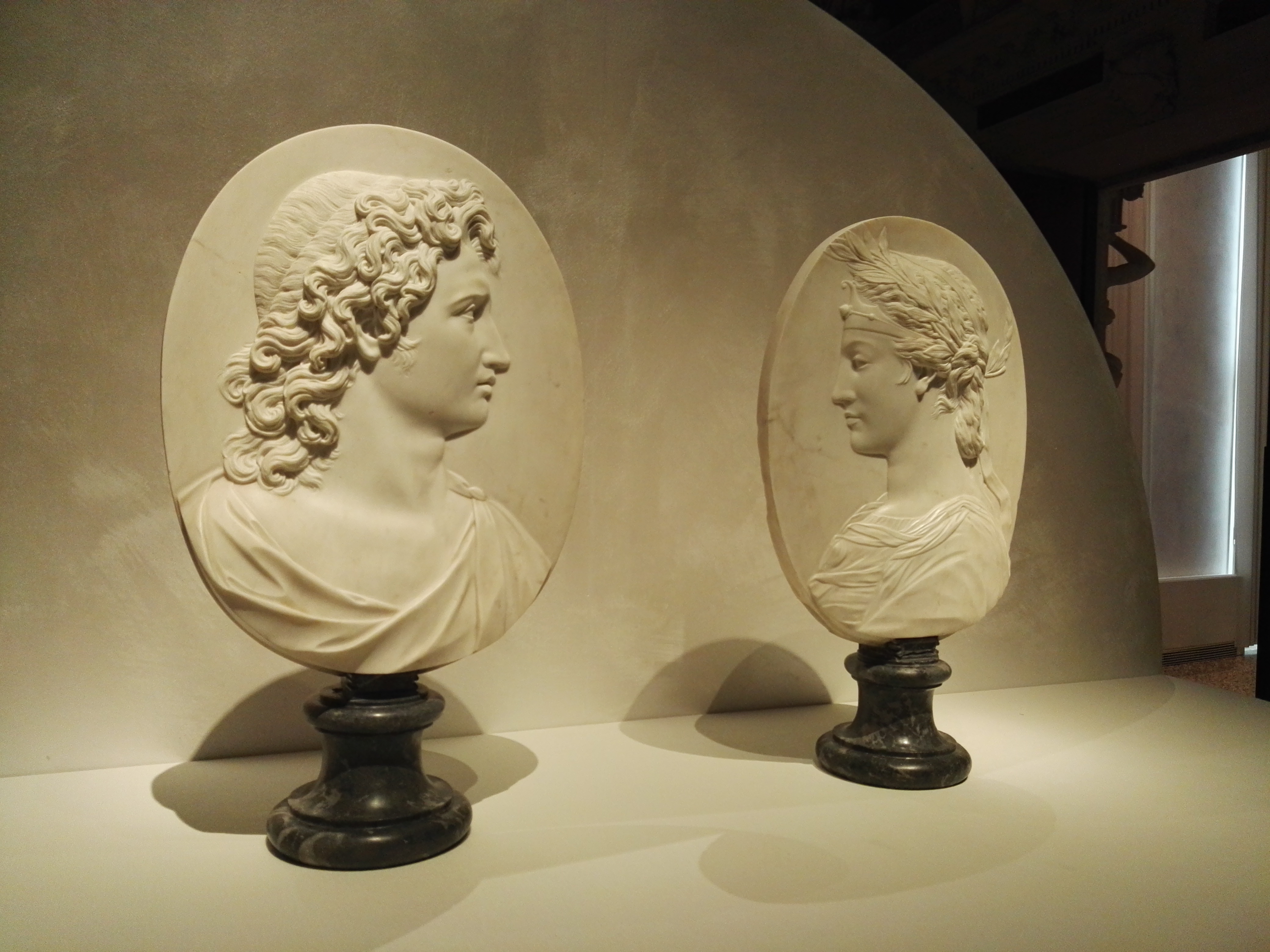 Medaglioni in marmo di Filippo Collino con i ritratti di Alessandro e Olimpia dai musei Reali di Torino (foto Graziano Tavan)