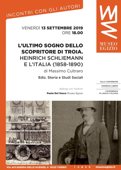 Schliemann voleva donare all’Italia parte della collezione troiana. Al museo Egizio di Torino l’archeologo Massimo Cultraro presenta il suo libro “L’ultimo sogno dello scopritore di Troia. Heinrich Schliemann e l’Italia (1858-1890)”