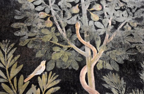 Il grande albero di fico con il serpente dipinto nella Casa del Frutteto a Pompei (foto parco archeologico Pompei)