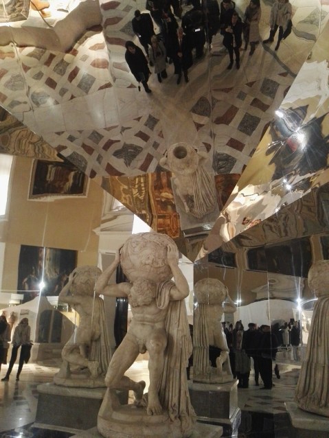 Il singolare allestimento a specchi che permette di apprezzare l’Atlante Farnese in tutte le sue sfaccettature (foto Graziano Tavan)