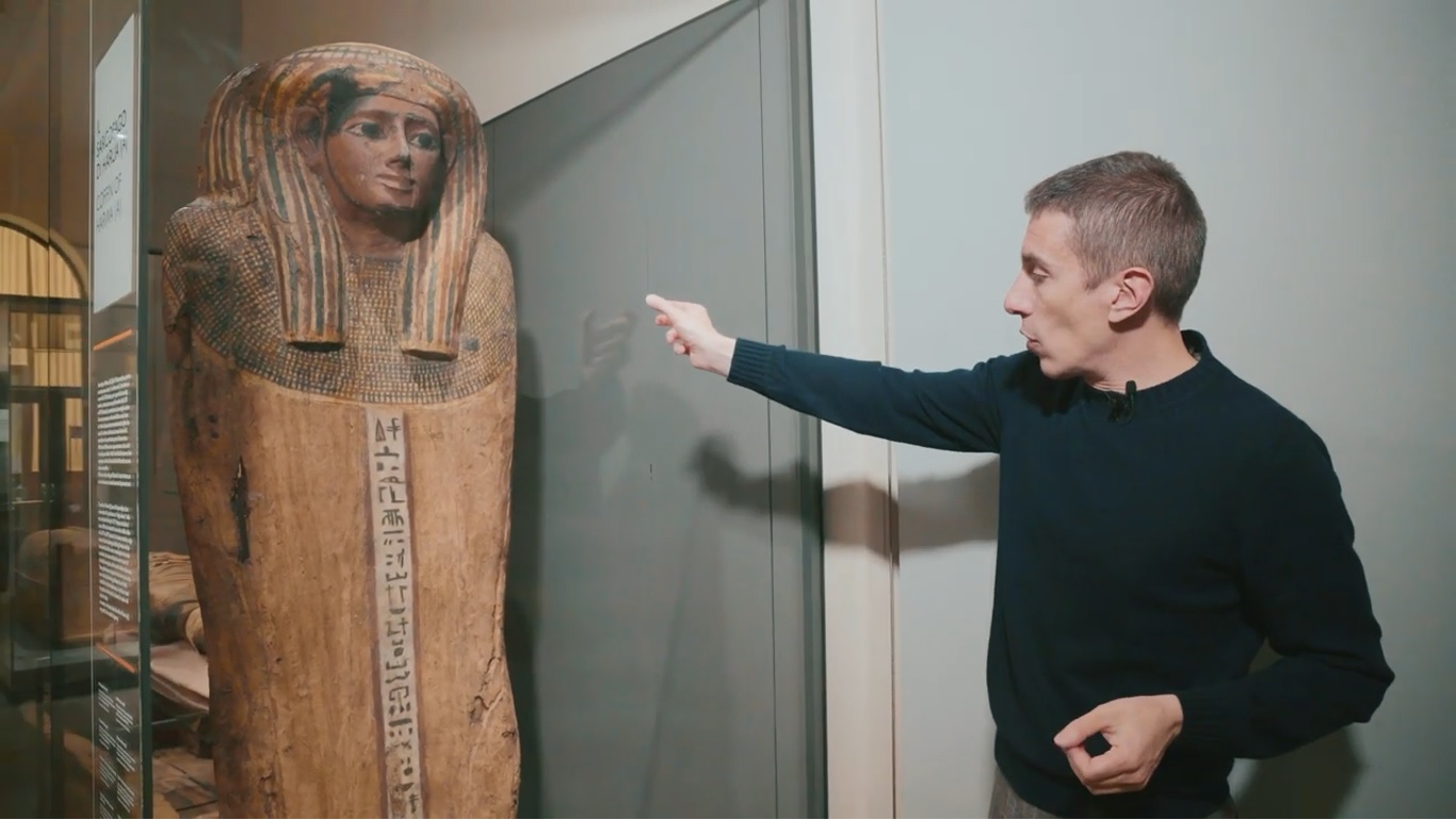 Col 23.mo appuntamento delle “Passeggiate del direttore” siamo ancora nel Terzo Periodo Intermedio. Il direttore Christian Greco fa un approfondimento sull’evoluzione dell’arte funeraria nell’Antico Egitto, soffermandosi sui sarcofagi di Harua e Mentuirdis, e su un cosiddetto sarcofago a pilastrini. Durante la XXV-XXVI dinastia si possono trovare sarcofagi con meno decorazione. In quello di Harua, ad esempio, vi è una colonna di testo solo al centro, un collare wsekh e poi non vi è nessun altro tipo di decorazione. “Ma come è possibile tutto ciò?”, si chiede il direttore Christian Greco. “Lo possiamo capire. Un collega norvegese ha scritto un libro molto importante sull’argomento, Anders Bettum, che si chiama “Nesting coffins”. Ovvero per preservare il corpo, per assicurare che il corpo possa essere preservato durante la vigilia della notte. E perché il defunto possa avere tutte le informazioni possibili per giungere nell’aldilà è importante che un sarcofago messo all’interno dell’altro possa avere tutti quei testi di cui ha bisogno. È proprio nell’unità dei vari sarcofagi che il defunto trova tutto ciò di cui ha bisogno”. Anche un altro sarcofago, quello di Menturdis, esposto al museo Egizio accanto a quello di Harua, ha semplicemente una colonna di testo al centro, un collare wsekh, e nessun’altra decorazione. “Vediamo però che nel sarcofago esterno, sui lati, vi sono le divinità canopiche che sono proprio quelle che attendono alla Stundenwachen, ovvero alla vigilia notturna. E se osserviamo poi sul coperchio del sarcofago interno vediamo una bellissima rappresentazione della dea dell’Occidente, Imentet, colei che deve accompagnare il defunto nell’aldilà e fare in modo che possa sopravvivere in eterno”.