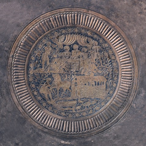 Particolare del medaglione centrale del piatto in argento dorato, con scena di banchetto all’aria aperta e rappresentazione di stalliere con cavallo (fine IV secolo o inizi del V secolo d.C.) conservato al museo Archeologico di Cesena (foto Ravennantica)