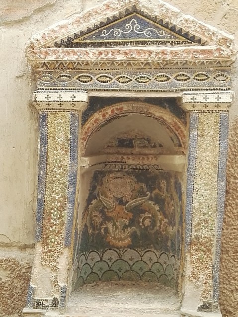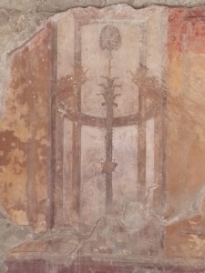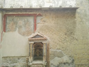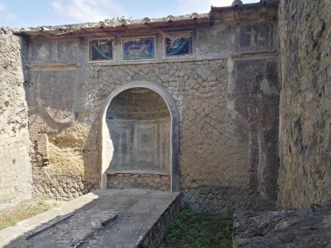 “Al centro abbiamo questo piccolo larario che è una vera e propria gemma per questa casa. Ai suoi piedi ci doveva essere un piccolo bacino d’acqua e in questo ambiente, quindi fresco d’estate, troneggiava il larario che ha la forma di un piccolo tempietto completamente decorato da tessere di marmo e da tessere di mosaico di varia natura, dove il colore azzurro ed era uno dei materiali più preziosi che costava di più sul mercato, è ampiamente utilizzato, così come le conchiglie, che abbiamo imparato a conoscere in tanti altri piccoli ninfei della zona di Ercolano e dell’area vesuviano in generale. Molto interessante è sul fondo di questo larario la presenza di una sorta di maschera gorgonica, questa una Gorgone buona che sorge da un cespo di acanto una pianta tipica del Mediterraneo, molto amata nell’arte greca e romana e che questa volta non portava i segni della terrificante Gorgone del mito greco, ma è una Gorgone che oramai portava anche questa gioia, fermava i momenti belli che qui dovevano svolgersi”.