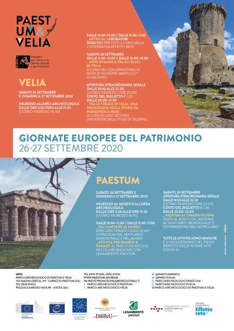 Sabato 26 e domenica 27 settembre 2020, il Parco Archeologico di Paestum e Velia sarà aperto dalle 9 alle 19:30 (ultimo ingresso alle 18:45); in programma sabato 26 settembre 2020 l’apertura straordinaria delle due aree archeologiche e del Museo di Paestum dalle 19:30 alle 22:30 con biglietto di ingresso a 1 euro acquistabile alle biglietterie del Parco dalle 19 alle 22. Per le Giornate Europee del Patrimonio 2020, Paestum potenzia la sua offerta culturale con le attività per bambini e ragazzi presso il Parco dei Piccoli, il parco giochi a tema archeologico con 10 strutture tra giochi antichi e ricostruzioni di macchine da cantiere ideato in collaborazione con Legambiente Paestum. Ampio spazio verrà riservato all’archeologia pubblica e alle visite agli scavi in corso nell’area archeologica di Paestum allo scopo di spiegare ai visitatori il mestiere dell’archeologo e la metodologia della ricerca archeologica. In programma visite al cantiere presso il tempio di Nettuno e ai resti del tempietto di V sec. a.C. rinvenuto presso il lato ovest delle mura di cinta durante i lavori di pulizia e restauro e attualmente conservati nella sala cella del museo di Paestum. In occasione dell’apertura straordinaria serale, torna nell’area archeologica “Paestum al chiaro di luna”, le suggestive visite al buio con lanterne nel Santuario meridionale, con distribuzione dell’astrolabio.