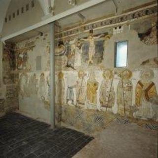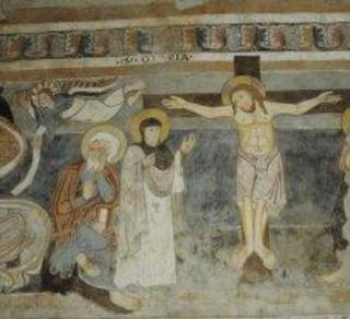 Facendo un’analisi iconografica si osserva come il ciclo sia diviso in due registri. “Nel primo registro”, illustra la storica dell’arte, “troviamo un ciclo cristologico con gli episodi più significativi della vita di Cristo, dall’Annunciazione – dove riconosciamo l’Arcangelo Gabriele e la Vergine mentre sta filando -, alla Natività – dove troviamo una matrice di sicura origine orientale bizantina che vede la Vergine distesa e un Bambino che è già un po’ adulto di fianco alle immagini di San Giuseppe e di un angelo -, per seguire poi con l’immagine più emblematica del Cristianesimo la Crocifissione: un Cristo che si sta già un po’ allontanando dalle tipologie orientali del Christus triumphans, del Cristo trionfante in croce, e somiglia già a quelle tipologie che iniziano a circolare dall’XI secolo di un Christus patiens, di un Cristo che soffre in croce, accanto alla Vergine dolente e a San Giovanni evangelista. E proprio alla fine di questo primo ciclo troviamo una figura che è estranea alle figurazioni più comuni nel territorio trentino, la figura di Sant’Osvaldo re. Come mai questa immagine in un ruolo e in una posizione così importante? Lo scopriamo andando a vedere quale fosse la posizione politica della famiglia dei Bozoni, in particolare di quell’erede che negli anni Venti del Duecento volle rivendicare il suo potere in quest’area, Nicolò da Stenico. Chiedendo alla bottega di pittori locali di realizzare qui nel ciclo il santo protettore dei conti di Appiano, Sant’Osvaldo re, il committente Nicolò da Stenico voleva ricordare sicuramente al principe vescovo di Trento che non solo i Bozoni erano al servizio dei principi vescovi ma erano anche vassalli dei conti d’Appiano, quindi una duplice posizione politica che viene ribadita poi nel secondo registro del ciclo di affreschi”.