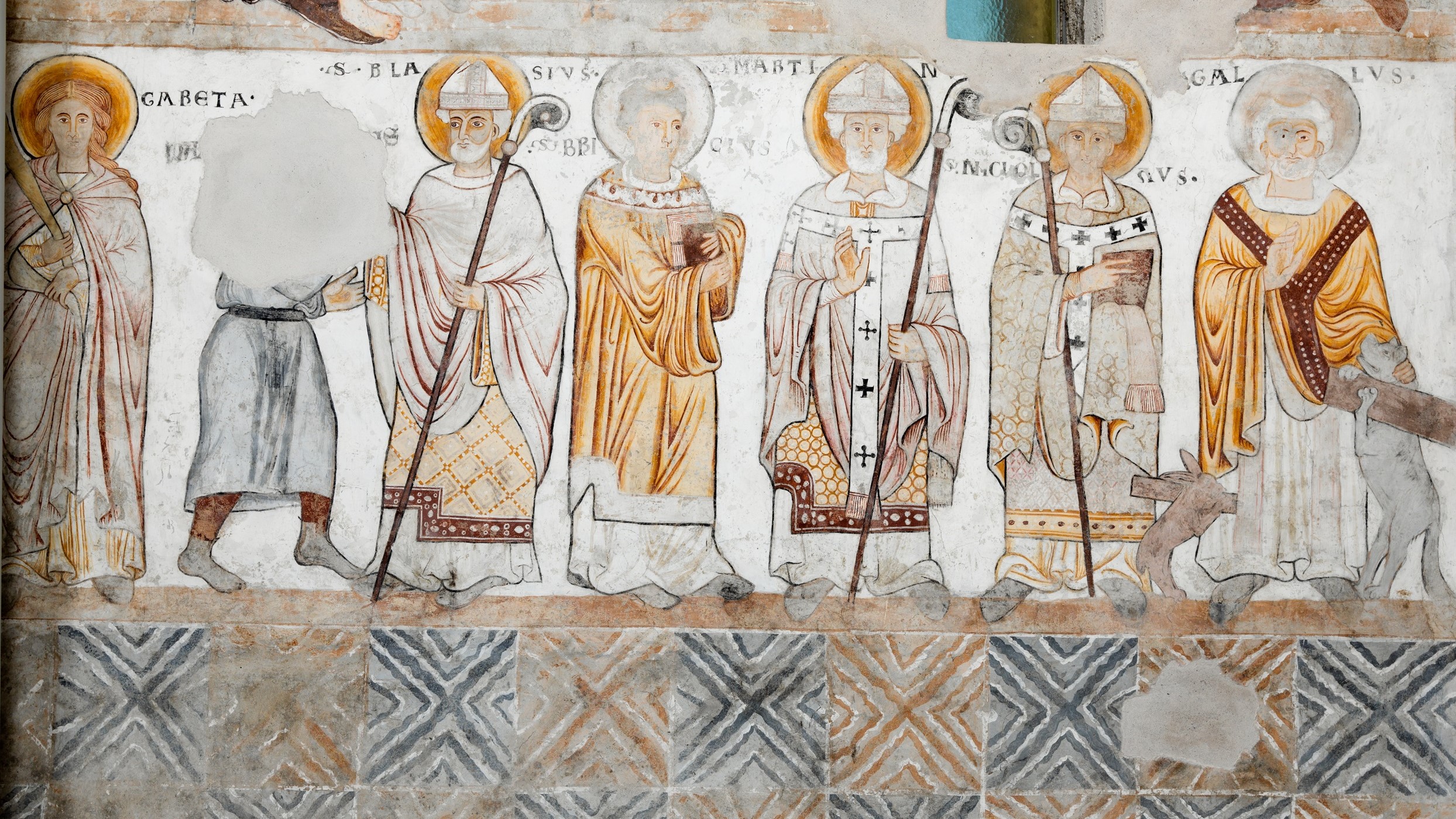 Nel secondo registro dell’affresco la scelta iconografica rivela una precisa volontà del committente. “Le figurazioni sono anche descritte da iscrizioni ben chiare”, continua Colla, “e al centro di questa fascia di affreschi compare, pur essendo all’interno di una cappella, un personaggio laico, probabilmente Bozone da Stenico, che, vicino a San Biagio che lo sta investendo di questo ruolo del feudatario, mostra delle chiavi legate alla cinta. Alla sua destra altre figure di santi: San Martino, santo cui è dedicata la cappella, in abiti vescovili con la mitra e il pastorale, accanto al suo suddiacono San Brizio, e con lo stesso livello di importanza San Nicola, probabilmente con un chiaro riferimento a Nicola da Stenico. Conclude il ciclo la figura di San Gallo, normalmente associata all’immagine dell’orso, che qui lo vediamo con una piccola lepre e un cane, un chiaro segno che la bottega che lavorò nella cappella di Stenico era una bottega effettivamente itinerante che mescolava le fonti iconografiche e talvolta si prendeva qualche libertà anche nella realizzazione dei paramenti sacri. Le figure dei santi hanno uno stile monumentale frontale. Invece sul lato sinistro della scena del personaggio laico abbiamo delle figure più legate al mondo bizantino: una scena tratta dal dodicesimo capitolo dell’Apocalisse di San Giovanni rappresenta la lotta tra il bene e il male, male rappresentato da un dragone rosso a sette teste che minaccia una figura femminile che sta mettendo al mondo il Salvatore, l’immagine di una Madonna col Bambino nella tipica iconografia della Madonna della tenerezza, tratta dalle 12 icone bizantine che sta in piedi sopra un globo a rappresentare il mondo caduco redento dalla venuta del Cristo; una salvezza ribadita poi dall’immagine della Sibilla immediatamente a destra che indica – come di consueto si faceva nel Medioevo – col segno delle corna il potere malefico del dragone. Chiude l’immagine di Santa Margherita martire. Nel 1238 la famiglia dei Bozoni perde il controllo di questo feudo. E i successori occultano il ciclo di affreschi che tanti riferimenti politici conteneva. Lo vediamo ancora sulla parete meridionale che rimane coperta per motivi statici e che rivela solo una piccola parte che ci fa immaginare come dovesse essere il ciclo per intero. Anche questa parte divisa in due registri con un ciclo legato ai miracoli di Cristo e un registro inferiore probabilmente ispirato alla vita di Sant’Osvaldo re”.