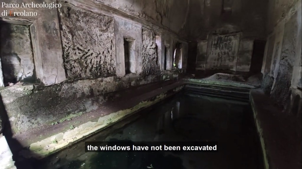 Nel calidarium si entra, come facevano anche gli antichi, attraverso una porta finestra che -come detto- serviva per poter uscire verso la vasca circolare. “Appena entrati – continua Sirano – si nota la presenza di un bordino di marmo che serviva a raccogliere le gocce d’acqua di chi stava uscendo dalla piscina. Una volta dentro il vano, gli occhi su devono abituare all’oscurità, che però non c’era nel periodo romano quando le finestre raccoglievano tantissima luce. Ma, come detto, le finestre sono state ancora lasciate non scavate. Si vede infatti ancora il flusso piroclastico e addirittura in una finestra gli scavatori hanno lasciato in situ, perché lo scavo non è completo, uno degli scuri che chiudevano la finestra in legno. Sul fondo di questa sala c’è un abside con i resti di decorazione dipinta, e si vedono anche una serie di nicchie alle pareti dove dovevano essere collocate delle statue che non sono state trovate però al momento dello scavo. Interessantissima la copertura a volta. Per creare la camera d’aria si utilizzavano delle tegole mammate, cioè delle tegole che avevano dei peducci ancora visibili che servivano a creare una piccola intercapedine in maniera che l’aria calda circolasse. Questo edificio aveva anche un sovrappiù di decoro. Oltre la cornice, con una modanatura a stucchi policromi ancora conservati, c’è un trattamento fatto con dei legni, con della spuma di lava, a finta rocaille, cioè si riproduce una specie di grotta. È come se avessero voluto imitare una grotta naturale”.