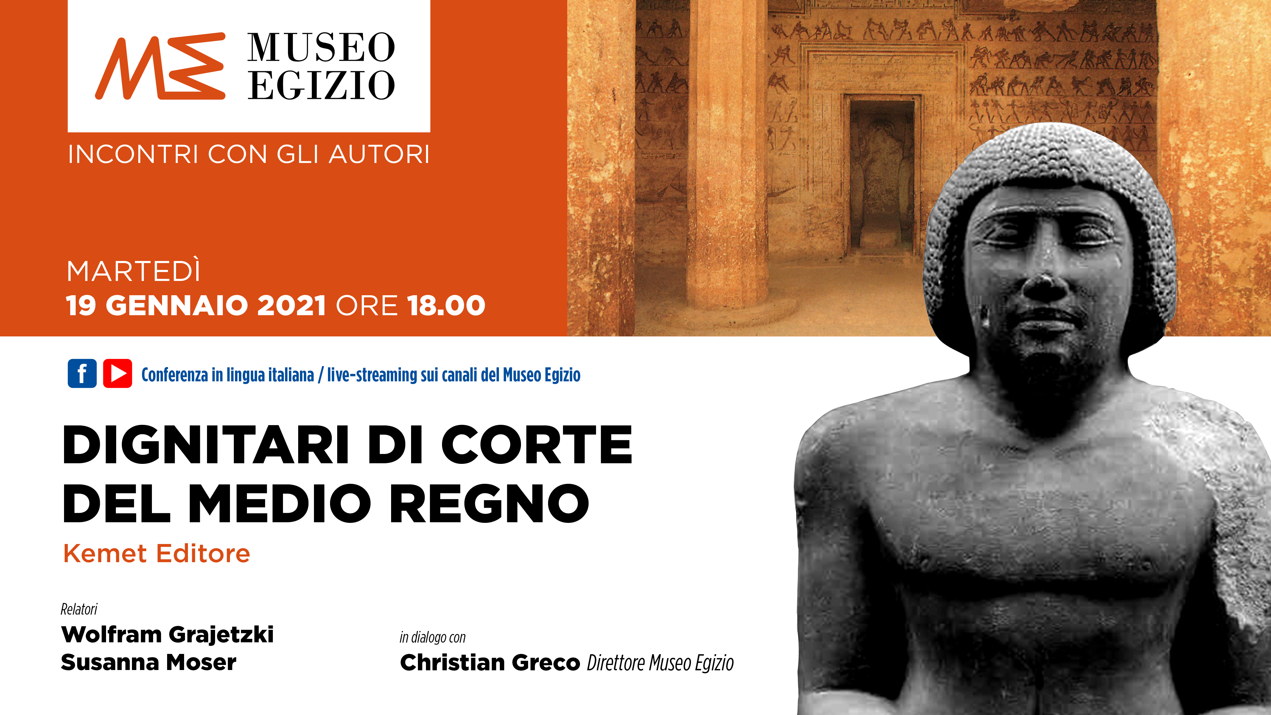 Per gli “Incontri con gli autori”, martedì 19 gennaio 2021, alle18, il museo Egizio di Torino ospita la presentazione del volume “Dignitari di corte del Medio Regno” (ed. Kemet) attraverso un dialogo tra l’autore Wolfram Grajetzki, la curatrice dell’edizione italiana Susanna Moser e il direttore del museo Egizio, Christian Greco. La conferenza sarà in lingua italiana e verrà trasmessa in streaming sul profilo YouTube e sulla pagina Facebook del museo Egizio.