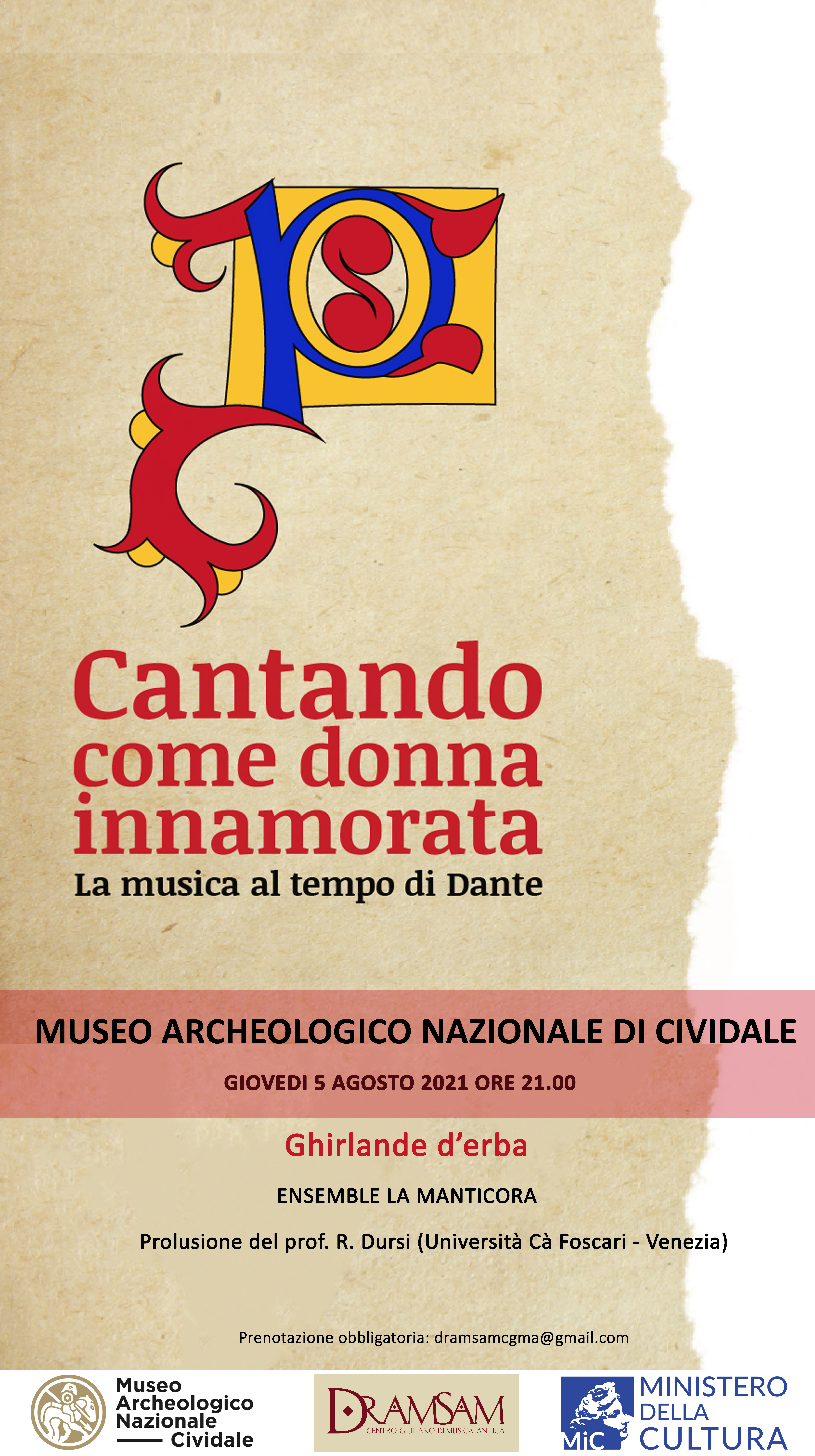 Il Festival Internazionale di Musica Cortese realizzato da Dramsam – Centro Giuliano di musica Antica torna a far tappa al museo Archeologico nazionale di Cividale del Friuli. Il programma, dal titolo “Cantando come donna innamorata: la musica al tempo di Dante”, quasi interamente dedicato al settimo centenario dantesco, prevede per giovedì 5 agosto 2021, alle 21, il concerto “Ghirlande d’erba” con l’Ensemble La Manticora, introdotto dalla prolusione del prof. Riccardo Drusi dell’università Ca’ Foscari di Venezia su “Uomo e natura nella polifonia del Codex Rossi”. Per l’occasione il Museo rimarrà aperto, senza soluzione di continuità, fino alle 22.30 (ultimo ingresso alle 22.30). Posti limitati, prenotazione obbligatoria scrivendo a dramsamcgma@gmail.com.