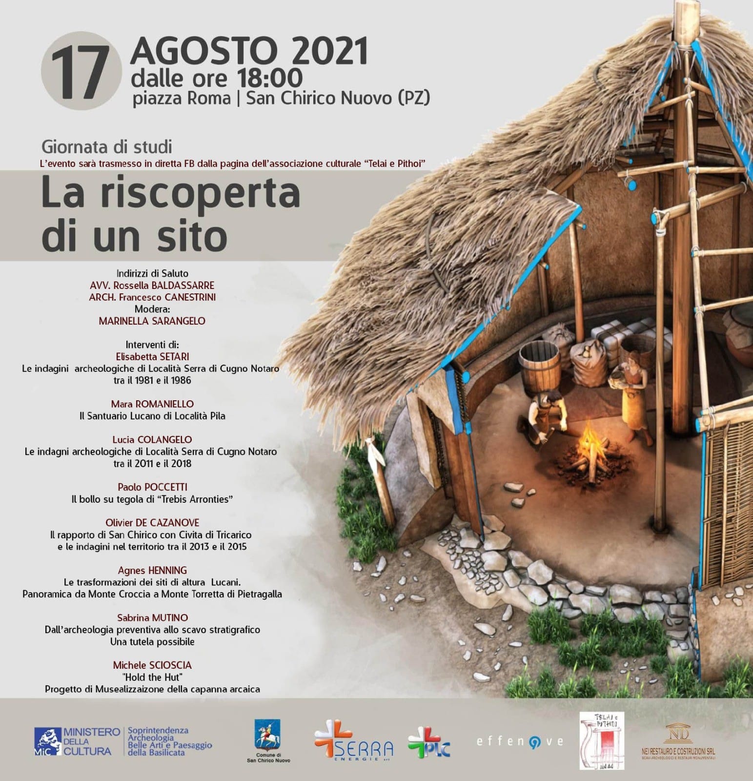 Giornata di studi “La riscoperta di un sito”, martedì 17 agosto 2021, alle 18: evento organizzato e sponsorizzato dall’associazione “Telai e Pithoi” di San Chirico Nuovo (che lo trasmetterà in diretta sulla propria pagina Facebook) e vede tra i partner la soprintendenza Archeologia Belle arti e Paesaggio della Basilicata e il Comune di San Chirico Nuovo, che ne hanno favorito la realizzazione, col contributo scientifico della Sabap e del mondo accademico, rappresentato in modo prestigioso da docenti universitari provenienti da diversi Istituti universitari europei – Parigi, Berlino e Roma- che, a vario titolo, si sono occupati di questo territorio. L’obiettivo è quello di offrire una ricostruzione storica su basi scientifiche per ricostruire un quadro coerente del popolamento di questo territorio nella diacronia. I dati delle ultime ricerche verranno letti alla luce delle “vecchie” scoperte, tra le quali si ricorda il famoso tesoretto di 146 monete recuperato negli scavi del 1986. Ai partecipanti sarà disponibile in anteprima il bimestrale di settembre-ottobre della rivista specializzata “Archeologia Viva”, dove un lungo articolo è dedicato proprio a questo sforzo di ricostruzione territoriale. Vediamo il programma: saluti di Rossella Baldassarre e Francesco Canestrini, modera Marinella Sarangelo. Interventi di: Elisabetta Setari (“Le indagini archeologiche di località Serra di Cugno Notaro tra il 1981 e il 1986”), Mara Romaniello (“Il santuario lucano di località Pila”), Lucia Colangelo (“Le indagini archeologiche di località Serra di Cugno Notaro tra il 2011 e il 2018”), Paolo Poccetti (“Il bollo su tegola di Trebis Arronties”), Olivier de Cazanove (“Il rapporto di San Chirico con Civita di Tricarico e le indagini nel territorio tra il 2013 e il 2015”), Agnes Hennig (“Le trasformazioni dei siti di altura lucani. Panoramica da monte Coccia a monte Torretta di Pietragalla”), Sabrina Mutino (“Dall’archeologia preventiva allo scavo stratigrafico. Una tutela possibile”), Michele Scioscia (“Hold the Hut”. Progetto di musealizzazione della capanna arcaica”).