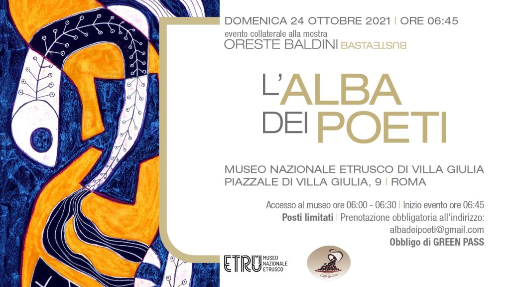 Una domenica al museo nazionale Etrusco di Villa Giulia a Roma alle 6 del mattino. BASTABUSTE, personale dell’artista Oreste Baldini (vedi Roma. Al museo nazionale Etrusco di Villa Giulia per “Etru di sera” apre la mostra “BASTA BUSTE”, personale di Oreste Baldini, spettacolare ciclo di opere sul tema del Plastic Free. La presentazione del direttore Nizzo e dello stesso autore | archeologiavocidalpassato), propone “L’alba dei poeti”, una performance unica, nell’abbraccio del giardino centrale di Villa Giulia. Una piccola grande adunanza da ascoltare in silenzio fra le più belle voci nel panorama dei poeti italiani, uniti nell’appello d’amore e difesa dei nostri luoghi. All’alba di domenica 24 ottobre 2021, alle prime luci del mattino, 20 celebri poeti contemporanei si riuniranno per la prima volta per leggere i loro versi, celebrare la poesia attraverso la tematica ambientale, la tutela e valorizzazione dei luoghi e della Terra in cui abitiamo. La poesia si eleva così, nell’alba che rischiara ciò che osserva e denuncia, nell’interpretazione corale di un senso diverso che riconosciamo e pretendiamo, per continuare ad essere nel mondo. “L’alba dei poeti” nasce da un’idea di Nicola Bultrini. Responsabili dell’evento: Antonella Giannaccaro e Marlene Socal. Partecipano i poeti: Annelisa Alleva, Luca Archibugi, Daniela Attanasio, Silvia Bre, Nicola Bultrini, Maria Grazia Calandrone, Davide Cortese, Francesco Dalessandro, Claudio Damiani, Elisabetta Destasio, Moira Egan, Emanuele Franceschetti, Marco Giovenale, Vittorio Lingiardi, Cinzia Marulli, Vincenzo Mascolo, Elio Pecora, Maria Concetta Petrollo, Lidia Riviello, Beppe Sebaste, Gabriella Sica, Sara Ventroni. Improvvisazioni musicali di Emanuele Bultrini, Pino Pecorelli, Ziad Trabelsi. Riprese fotografiche di Dino Ignani. Riprese video di Franco Diana. Grafica di Enrico Sartini. L’ingresso all’evento da parte del pubblico prenotato sarà consentito fra le 6 e le 06.30. La lettura dei poeti è prevista alle 6.45, nell’ultimo buio della notte, e proseguirà accompagnando il sorgere del sole. Ad aprire e chiudere l’incontro due improvvisazioni musicali eseguite da alcuni musicisti dell’Orchestra di Piazza Vittorio. A tutti i presenti verrà offerta la colazione grazie alla Coop. Soc. PANTA COOP, Caffè Galeotto. Evento con prenotazione OBBLIGATORIA all’indirizzo: albadeipoeti@gmail.com. Obbligo di Green Pass.