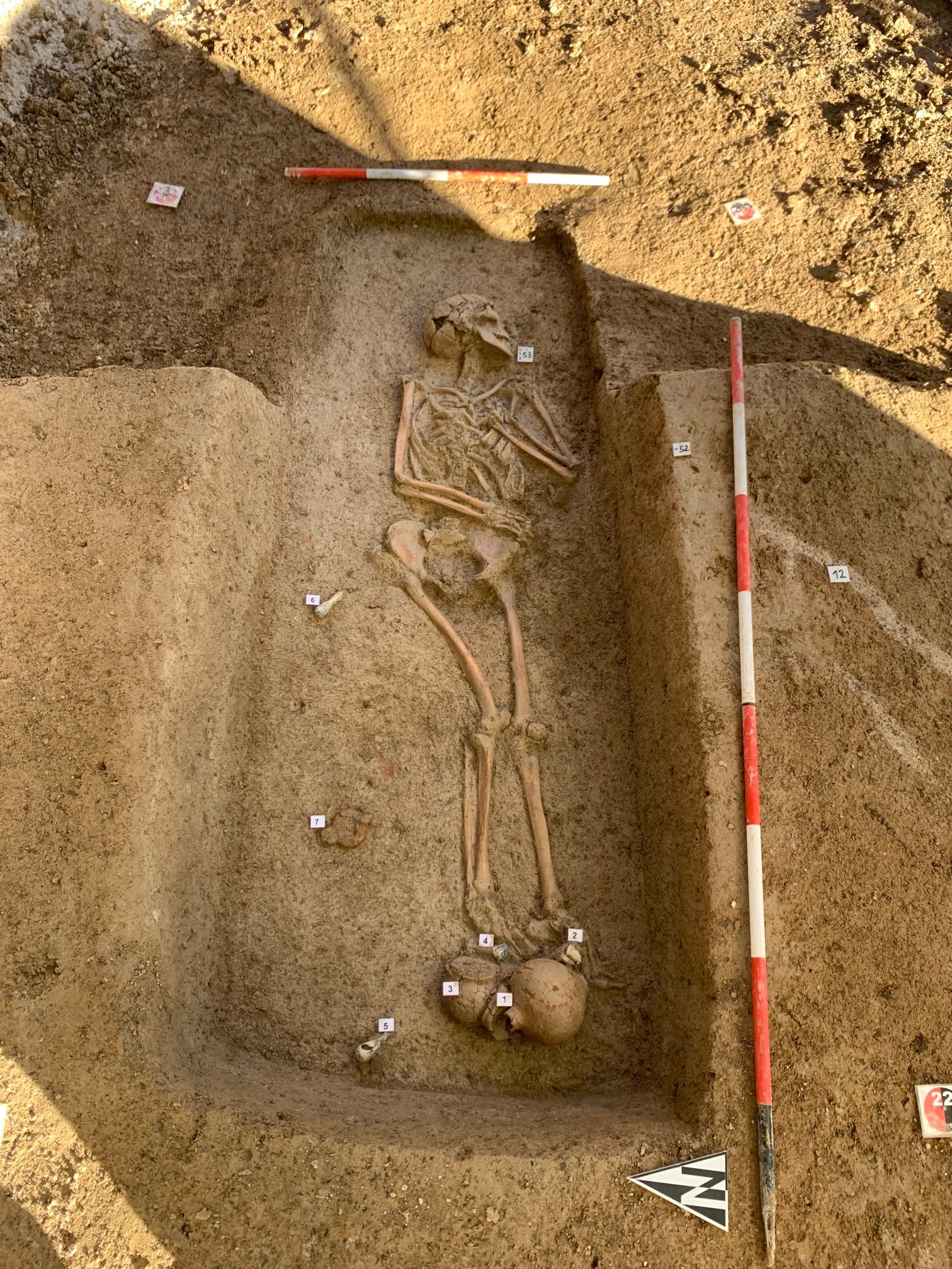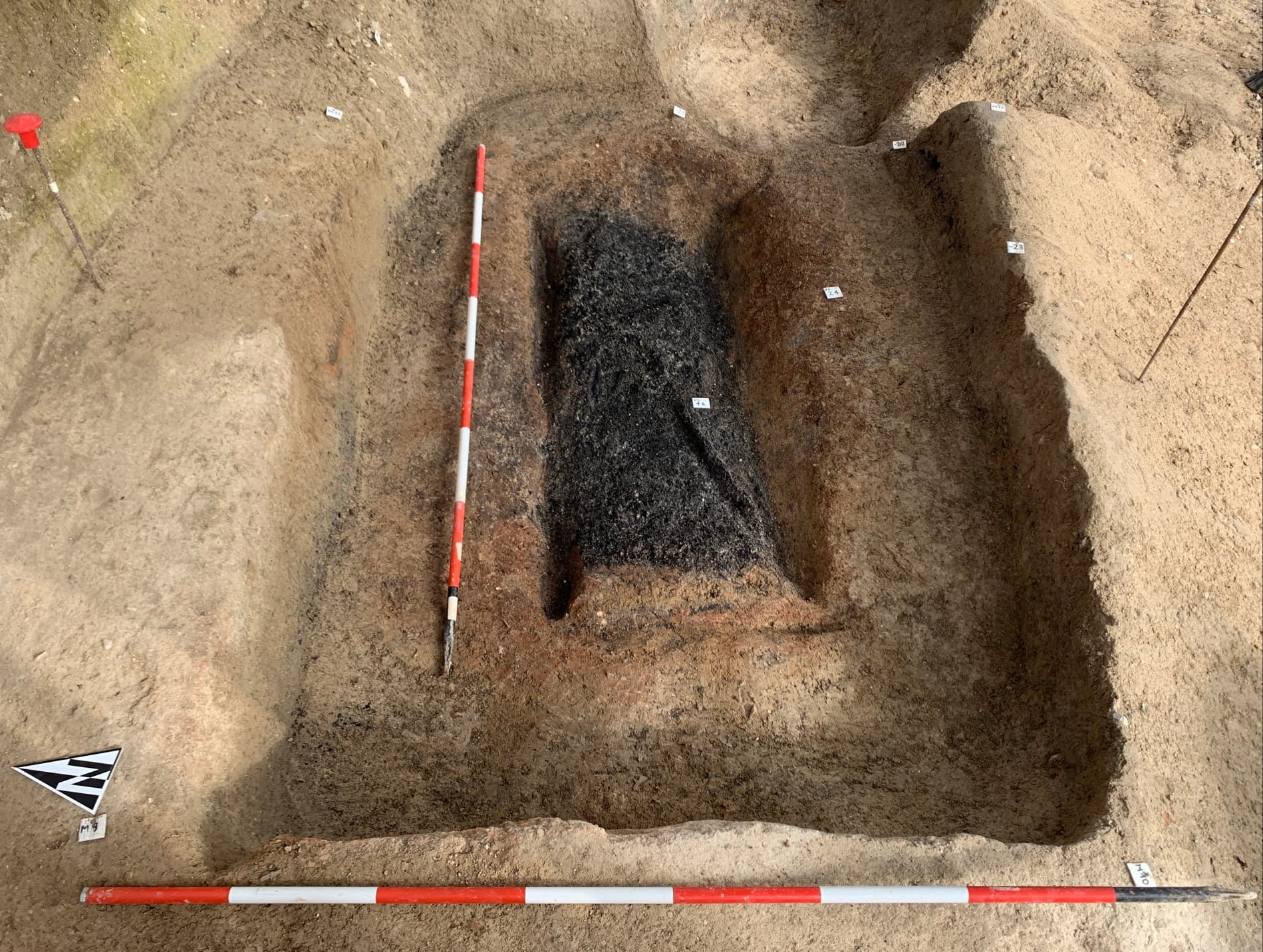 Al rito crematorio è associato anche quello a inumazione, seppur attestato in percentuali minori, come dimostrato dalle 3 tombe a fossa terragna indagate. I defunti, racchiusi in feretri lignei o avvolti in un sudario, sono stati deposti in semplici fosse terragne colmate con sola terra. “Sorprendente è l’integrità e lo stato di conservazione di gran parte dei contesti indagati”, sottolineano gli esperti. “Stupisce la perfetta conservazione dei resti combusti della pira, della lettiga funebre e dei feretri lignei; quest’ultimi chiaramente ricostruibili grazie al mantenimento in fase di decomposizione del materiale organico e della posizione originale dei chiodi”. A rimarcare il carattere “periurbano”, e non marginale, del sepolcreto è anche la presenza di un basamento di forma rettangolare (dimensioni ca 3.50 x 2.50 m), realizzato con una gettata contro terra di calcestruzzo e ciottoli di fiume, e certamente pertinente ad una struttura funeraria un monumentale sviluppo in elevato. Nonostante il pessimo stato di conservazione non permetta di ricondurlo ad una specifica tipologia architettonica, tale presenza sottolinea con fermezza la rilevanza topografica dell’intero contesto, ben visibile a chi si trovava a percorrere l’asse stradale.