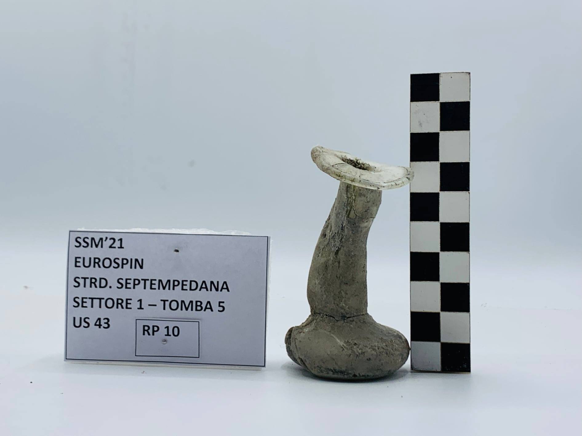 “Le testimonianze materiali recuperate all’interno dei sepolcri, e prontamente consolidate e messe in sicurezza durante le attività di cantiere, documentano solo parzialmente il vasto ed articolato corpus di gesti ed azioni rituali compiuti nella fase preparatoria al funerale, nell’atto stesso ed anche dopo. La maggior parte delle deposizioni, infatti, presenta percentuali consistenti di oggetti riferibili a classi di materiali ampiamente eterogenei. I singoli reperti sono deposti e bruciati all’atto della cremazione ma sono anche aggiunti successivamente, durante la ripulitura del rogo funebre e la risistemazione delle ossa combuste. Tra i materiali combusti stupisce l’elevata presenza di unguentari vitrei, sia frammentari che integri, ma deformati dal calore. Non manca, inoltre, la presenza di oggetti in bronzo tra cui si annovera uno splendido esemplare di specchio con disco circolare ed impugnatura sagomata a balaustro e un anello digitale privo di castone. Un chiaro valore escatologico è assegnato, invece, all’atto consuetudinario e quindi rituale, di deporre monete e lucerne fittili, puntualmente rinvenute in quasi tutti i sepolcri”.