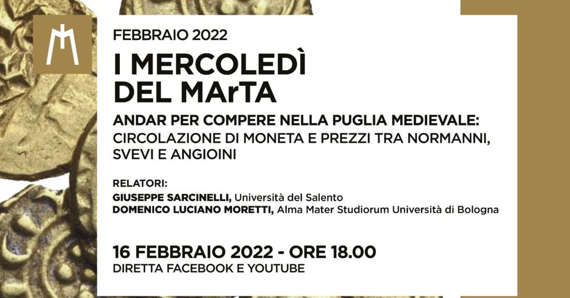 Nuovo appuntamento dei “Mercoledì del MArTa” dedicati al focus di febbraio su “Dare voce alla moneta: come un pezzo di metallo può diventare testimone della storia”. Sono infatti Giuseppe Sarcinelli (università del Salento) e Domenico Luciano Moretti (Alma Mater Studiorum università di Bologna), ad animare la conferenza ‘’Andar per compere nella Puglia Medievale: circolazione di moneta e prezzi tra Normanni, Svevi e Angioini’’ di mercoledì 16 febbraio 2022, alle 18, in diretta sui canali Facebook e YouTube del museo Archeologico nazionale di Taranto, introdotta e moderata dalla direttrice del MArTA, Eva Degl’Innocenti.