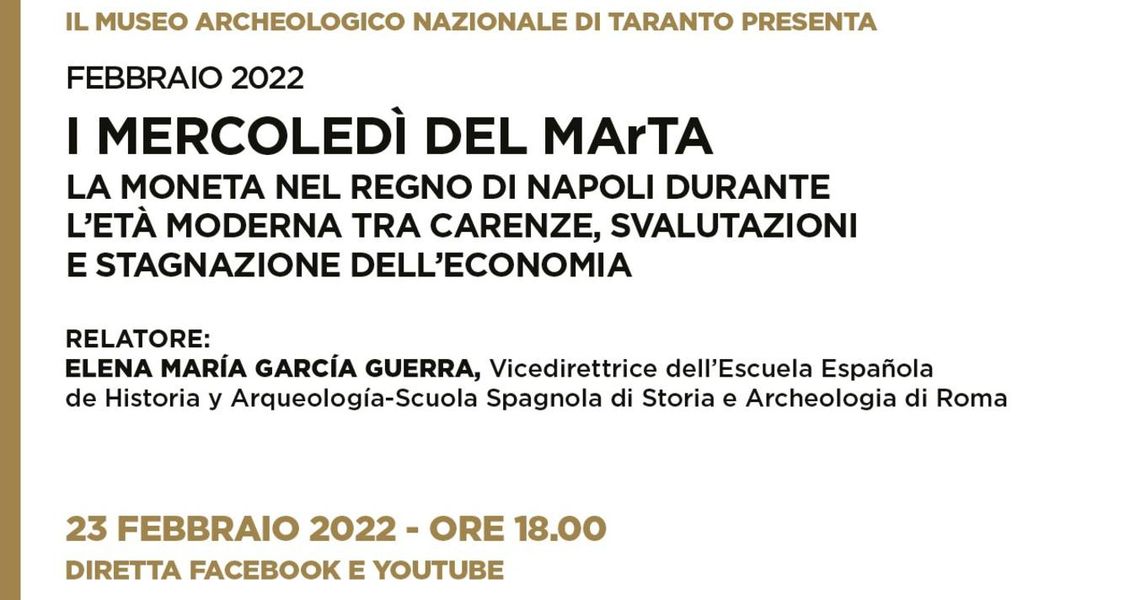 Taranto. Per i “Mercoledì del MArTA” appuntamento on line con Elena María García Guerra, vice direttrice dell’Escuela Española de Historia y Arqueología en Roma, su “La moneta nel Regno di Napoli durante l’età moderna tra carenze, svalutazioni e stagnazione dell’economia”
