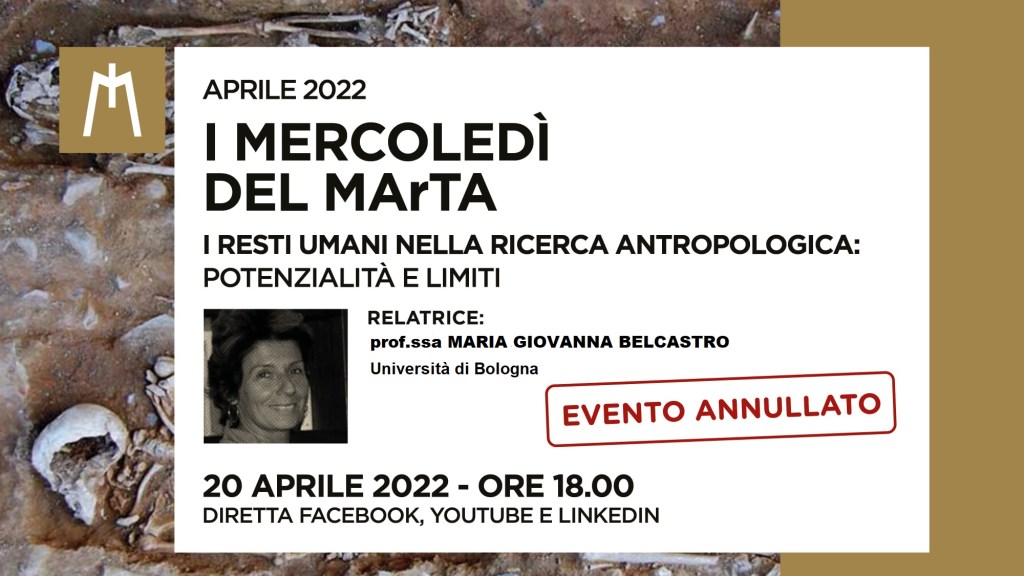 Attenzione! La diretta “I resti umani nella ricerca antropologica: potenzialità e limiti” con la prof.ssa Maria Giovanna Belcastro (università di Bologna) prevista per il 20 aprile 2022, alle 18, in diretta sulle pagine Facebook, YouTube e Linkedin del museo Archeologico nazionale di Taranto, è annullata. Sarebbe stato il terzo appuntamento di aprile dei “Mercoledì del MArTA”, dedicati ai “Racconti dall’oltretomba. Tra archeologia e antropologia dei resti umani”.