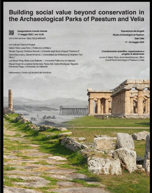 Al museo Archeologico nazionale di Paestum, sabato 17 maggio 2025, alle 10.30, in sala Cella, workshop internazionale “Building social value beyond conservation” promosso dal Politecnico di Milano e l’università di Napoli “Federico II”, con la direzione scientifica di Tiziana D’Angelo. Alla tavola rotonda intervengono il direttore dei Parchi Tiziana D’Angelo, Valerio Tolve e Luisa Ferro del Politecnico di Milano, Renato Capozzi e Federica Visconti dell’università di Napoli “Federico II”, Oana Diaconescu e Daniel Armenciu dell’Universitatea de Arhitectură și Urbanism “Ion Mincu”, Luis Bosch Roig e María José Ballester dell’Universitat Politècnica de Valencia, Miguel Angel de La Iglesia Santamaria, Flavia Zelli, Carlos Rodríguez e Sagrario Fernández Raga dell’Universidad de Valladolid. Alle 12, inaugurazione della mostra di fine workshop (fino al 23 maggio 2025) con cinque visioni progettuali per ripensare il valore sociale dei Parchi archeologici di Paestum e Velia: frutto del lavoro congiunto di studenti, tutors e docenti delle Scuole di Architettura di Milano, Napoli, Bucarest, Valencia e Valladolid.