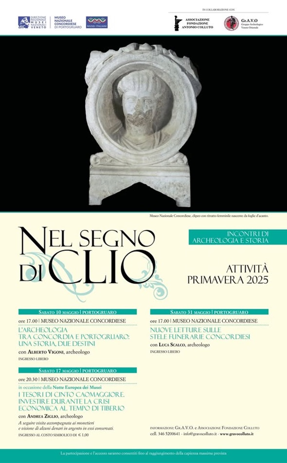 Sabato 31 maggio 2025, alle 17, al museo Archeologico nazionale Concordiese di Portogruaro, la conferenza “Nuove letture sulle stele funerarie concordiesi” con l’archeologo Luca Scalco, terzo e ultimo incontro della rassegna di incontri di archeologia e storia “Nel segno di Clio”, a cura della direzione regionale Musei nazionali Veneto, in collaborazione con il Gr.A.V.O. e l’associazione “Fondazione Colluto”, occasione importante per riscoprire il passato attraverso le testimonianze archeologiche conservate in Museo. Ingresso libero per i partecipanti.