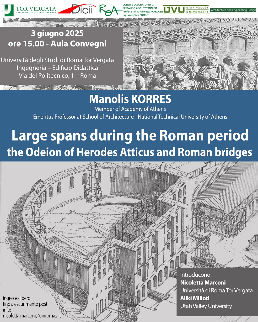 Lezione aperta martedì 3 giugno 2025 all’università di Roma Tor Vergata su “Large spans during the Roman period. The Odeion of Herodes Atticus and Roman bridges” con Manolis Korres, membro della Academy of Athens e professore emerito alla School of Architecture – National Technical University of Athens. Introducono Nicoletta Marconi, università di Roma Tor Vergata, e Aliki Milioti, Utah Valley University. Appuntamento alle 15 nell’aula convegni di Ingegneria – Edificio Didattica, università di Roma Tor Vergata, in via del Politecnico 1 a Roma.