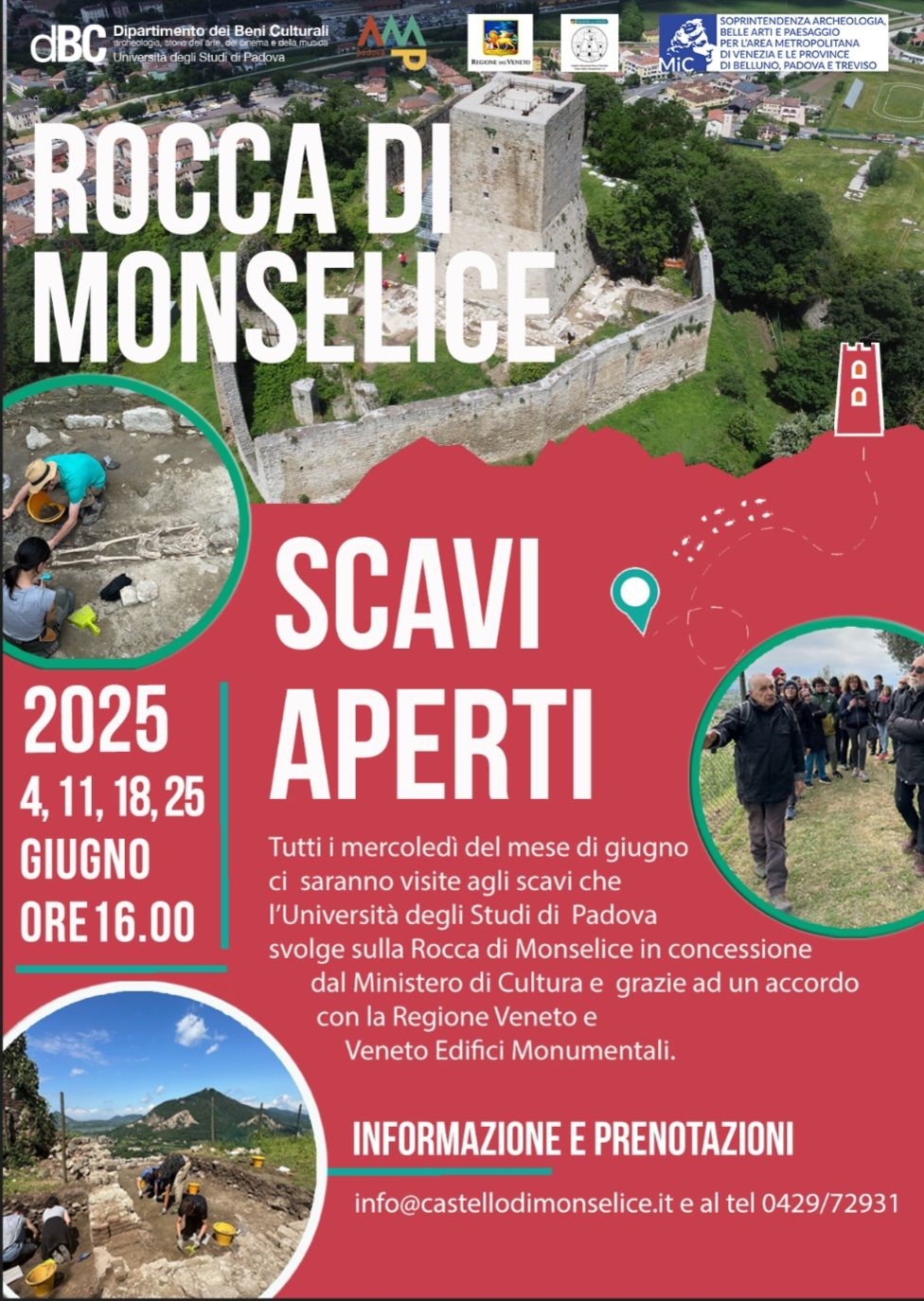 L’appuntamento è per tutti i mercoledì di giugno 2025 sulla Rocca di Monselice (Pd) per “Scavi aperti”. Tornano infatti le visite guidate agli scavi archeologici sul Colle della Rocca di Monselice dove l’università di Padova opera su concessione del ministero della Cultura e grazie a un accordo con la Regione Veneto e Veneto Edifici Monumentali. Appuntamento quindi mercoledì 4, 11, 18 e 25 giugno 2025 alle 16. Prenotazioni e info: info@castellodimonselice.it, tel. 0429 72931.