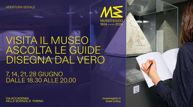 “Visita il museo, ascolta le guide, disegna dal vero”: anche a giugno 2025 il museo Egizio di Torino propone l’iniziativa per scoprire le collezioni in chiave inedita. Sabato 7, 14, 21 e 28 giugno 2025 il museo Egizio sarà aperto fino alle 20. Con il biglietto di ingresso, dalle 18:30, potrai usufruire di pillole egittologiche gratuite, disponibili lungo il percorso di visita, oltre che portare taccuino e matita per disegnare i tuoi reperti preferiti. Acquista il tuo biglietto al link https://egizio.museitorino.it/