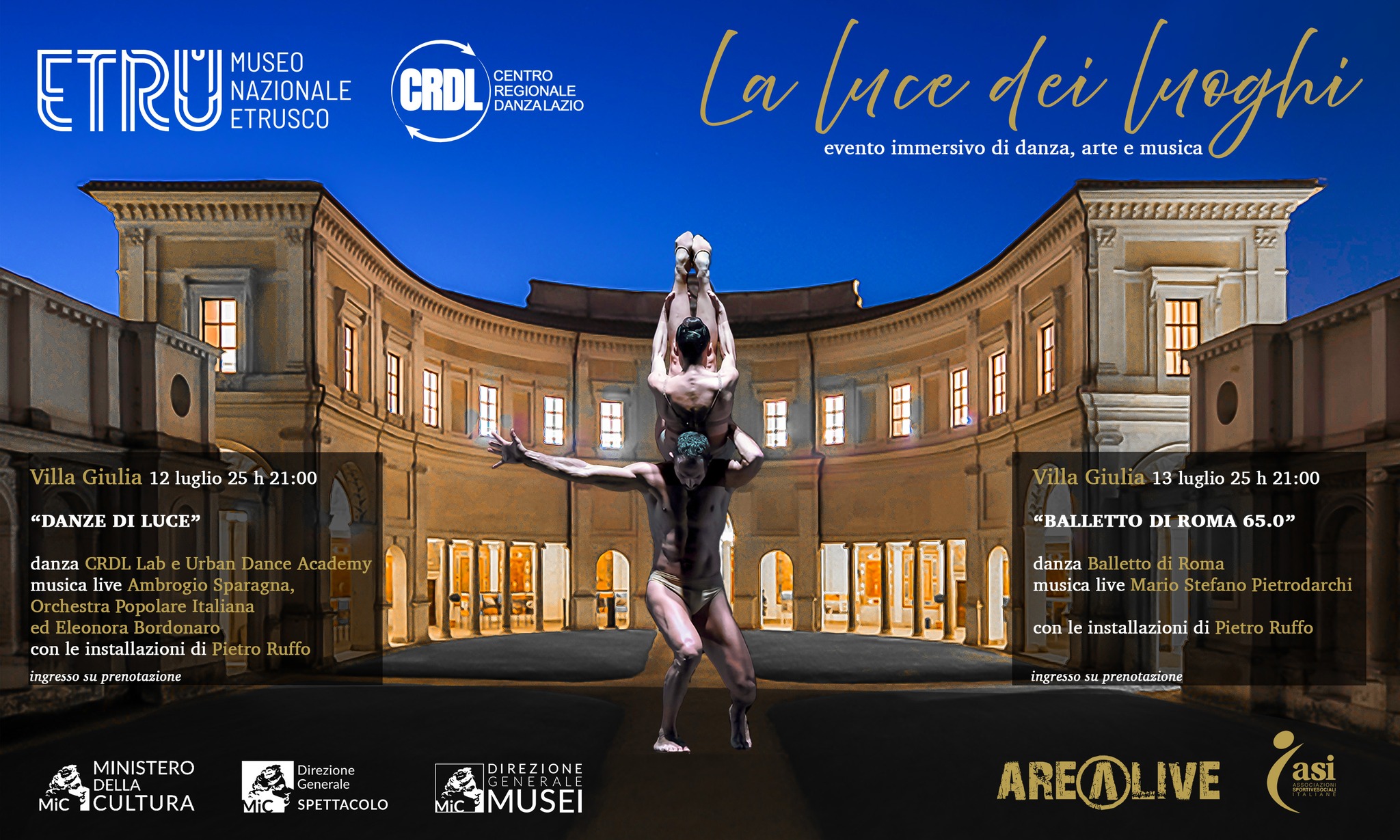 Sabato 12 luglio 2025, ore 21: “Danze di luce”. Serata Multidisciplinare con Mvula Sungani Physical Dance, CRDL Lab, DCE Produzioni, UDA Academy, con la partecipazione dell’Orchestra Popolare Italiana e la musica live di Ambrogio Sparagna. Domenica 13 luglio 2025, ore 21: “Balletto di Roma 65.0”. Serata di Danza con il Balletto di Roma, nell’anniversario dei suoi 65 anni di attività e che proprio al Ninfeo di Villa Giulia realizzò il suo primo spettacolo. Elemento distintivo del progetto sarà il “Giardino Planetario” di Pietro Ruffo, opera immersiva site-specific, installazione eterea in voile, raffigurante una foresta primordiale, che dialogherà con la danza, gli affreschi e il giardino storico del Museo, offrendo al visitatore un’esperienza unica e coinvolgente.