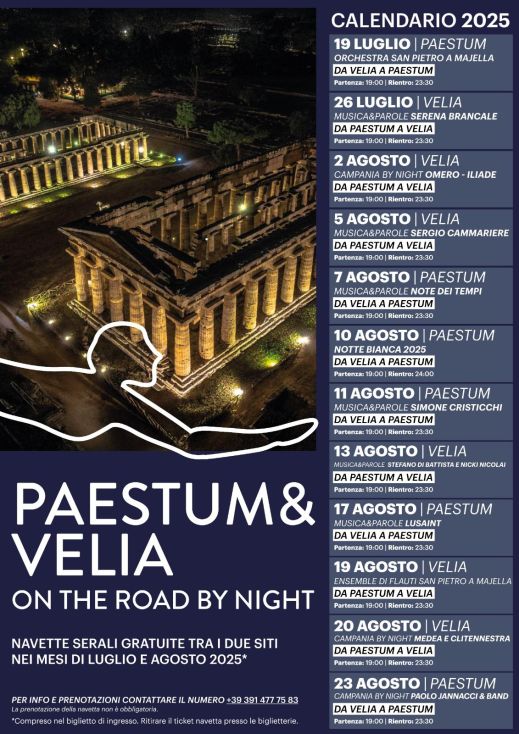 Calendario “PAESTUM E VELIA ON THE ROAD BY NIGHT”. Luglio 2025: 19 luglio – Orchestra del Conservatorio San Pietro a Majella (Paestum), navetta da Velia a Paestum; 26 luglio – Serena Brancale in concerto (Velia), navetta da Paestum a Velia. Agosto 2025: 5 agosto – Sergio Cammariere (Velia), navetta da Paestum a Velia; 7 agosto – “Note dei tempi” con Rita Forte, Amedeo Minghi, Fausto Leali, Mario Rosini e la Quisisona Orchestra (Paestum), navetta da Velia a Paestum; 10 agosto – Notte Bianca a Paestum, navetta da Velia a Paestum, con rientro a mezzanotte; 11 agosto – Simone Cristicchi (Paestum), navetta da Velia a Paestum; 13 agosto – Stefano Di Battista Quartet (Velia), navetta da Paestum a Velia; 17 agosto – Lusaint (Paestum), navetta da Velia a Paestum; 19 agosto – Ensemble di Flauti del Conservatorio (Velia), navetta da Paestum a Velia.