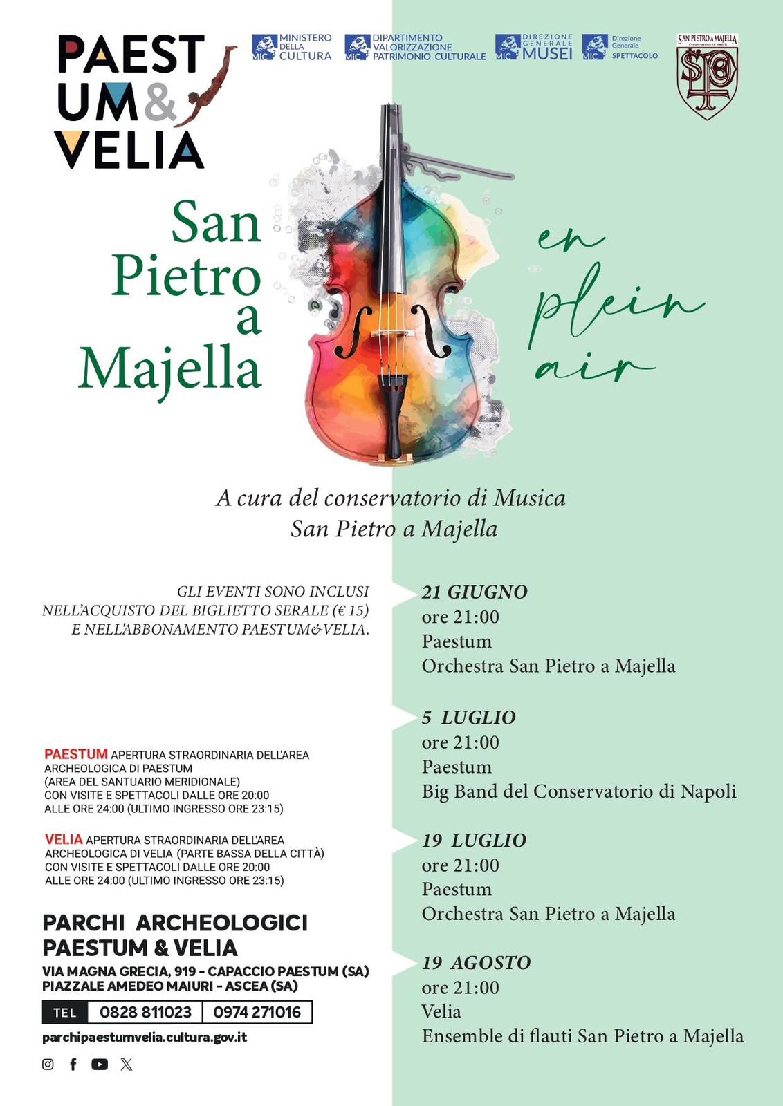 Sabato 19 luglio 2025, alle 21, nello scenario del tempio di Nettuno al tramonto, al santuario Meridionale di Paestum, secondo appuntamento con la rassegna “San Pietro a Majella en plein air”, frutto della collaborazione tra i parchi archeologici di Paestum e Velia e il Conservatorio di Musica San Pietro a Majella di Napoli. Sul palco, allestito tra le testimonianze dell’antica Paestum, salirà l’Orchestra del Conservatorio San Pietro a Majella, diretta da Giuseppe De Fusco, con Lino Costagliola al pianoforte. Il programma abbraccerà grandi capolavori di Wolfgang Amadeus Mozart come L’impresario (Der Schauspieldirektor) ouverture K486, Concerto per pianoforte e orchestra in re minore n° 20 K466 e Sinfonia in re maggiore n° 35 K385 “Haffner”. Una serata per ascoltare la storia attraverso le sue note più alte. Apertura straordinaria dell’area archeologica di Paestum (area del santuario Meridionale) ultimo ingresso 23.15. Ingresso: i concerti sono inclusi nel biglietto serale d’ingresso ai Parchi (15 euro) e nell’abbonamento “Paestum & Velia”. Servizio navetta gratuito.