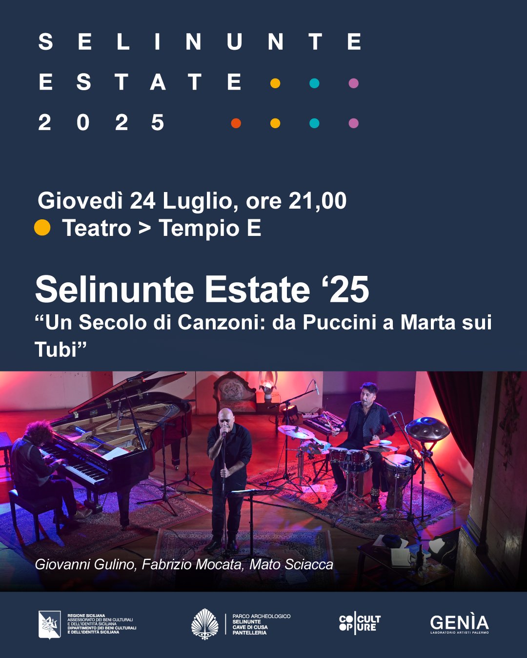 Un nuovo appuntamento di Selinunte Estate 25, il cartellone culturale che porta la musica tra i templi e accende la notte del Parco con il linguaggio universale delle emozioni. Giovedì 24 luglio 2025, alle 21, al parco archeologico di Selinunte “Un secolo di canzoni: da Puccini ai Marta Sui Tubi”, viaggio sonoro lungo cent’anni: dai vertici lirici di Giacomo Puccini al rock d’autore dei Marta sui Tubi, passando per la grande canzone italiana. Un concerto inedito, tra contaminazioni, memoria e sperimentazione, per voce, pianoforte e percussioni. Sul palco Giovanni Gulino, fondatore e voce storica dei Marta sui Tubi; Fabrizio Mocata, pianista internazionale, candidato italiano ai Latin Grammy 2024; Mato Francesco Sciacca, percussionista d’eccellenza, tra sonorità etniche e mediterranee. In scaletta: Modugno, Dalla, Battisti, Battiato, Area, fino ai Marta sui Tubi con arrangiamenti originali e una cifra interpretativa ricca di sensibilità e visione artistica. Prenotazioni su coopculture.it o al botteghino del Parco.